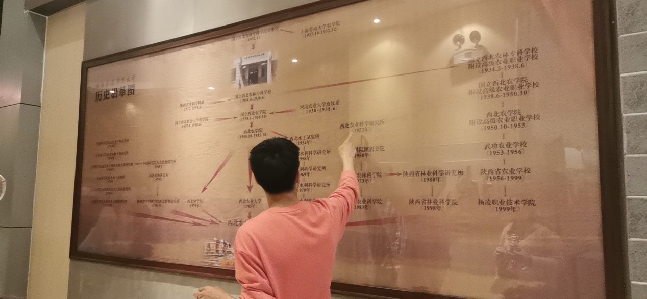 下午,支部同志们在博览园门口集合完毕后,由党员孙志同同志作为本次活动的讲解员。孙志同同志从建校选址讲起,结合学校在不同时代的发展历程,生动地为大家解读了我校校训和办学理念。通过讲解,大家深深感受到建校以来代代学者先贤胸怀社稷、情系苍生,秉承“经国本,解民生,尚科学”的办学理念为推动国家农业进步做出的巨大贡献,也体悟了积淀深厚、薪火相传的“诚朴勇毅”的西农精神。孙志同同志带领大家回顾了我校新中国成立前十五年的艰辛开拓、新中国成立后十七年的发展壮大、改革开放时期的发展与变迁、西北农林科技大学合并组建后的全面腾飞的五个阶段。