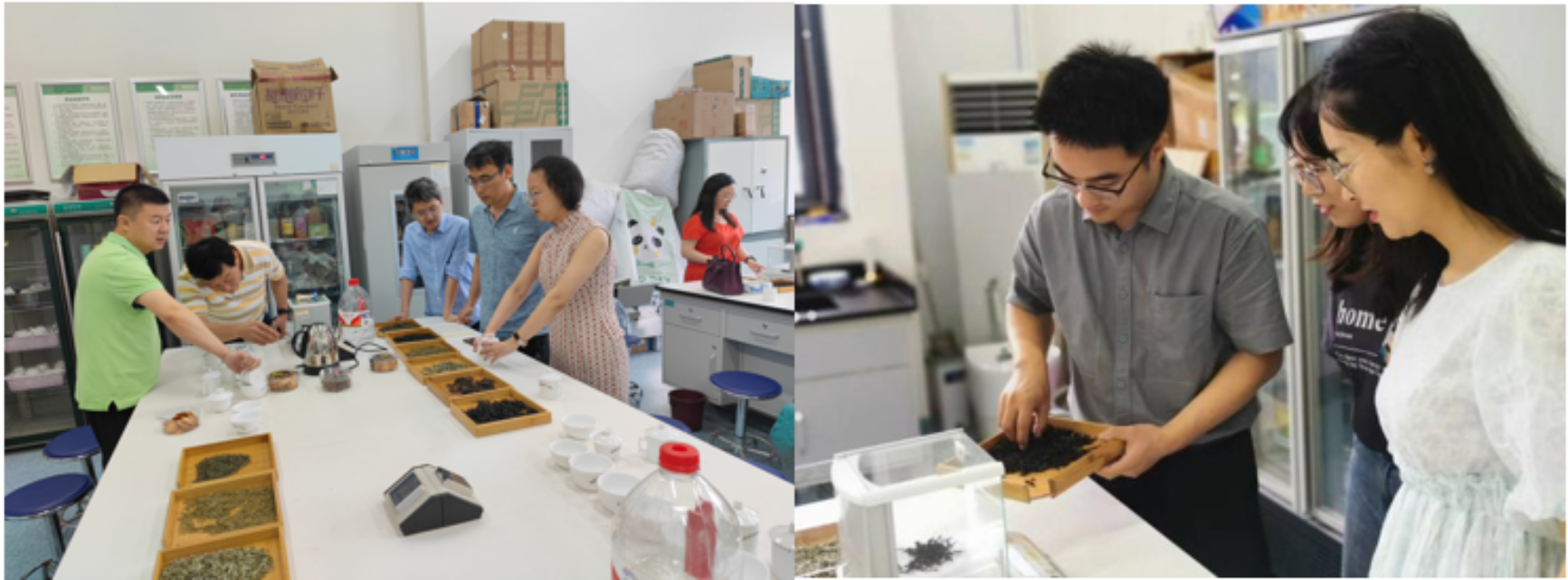 好茶需细品。在理论讲解之后,老师们借助评审室茶具,在专业老师的指导下,使用提前准备好的肉桂、白毫银针、泾渭茯茶等六大茶类茶样进行了审评实践。认真地称茶叶3克,倒入沸水浸泡3-5分钟,揭茶盖,闻茶香,品茶味。亲自闻到了六大茶类香气四溢,品尝了喝入口中各有千秋的味道,白茶泛淡香,红茶清誉高香,绿茶微苦回甘,黄茶、黑茶温润甘甜,青茶芳香而醇厚。