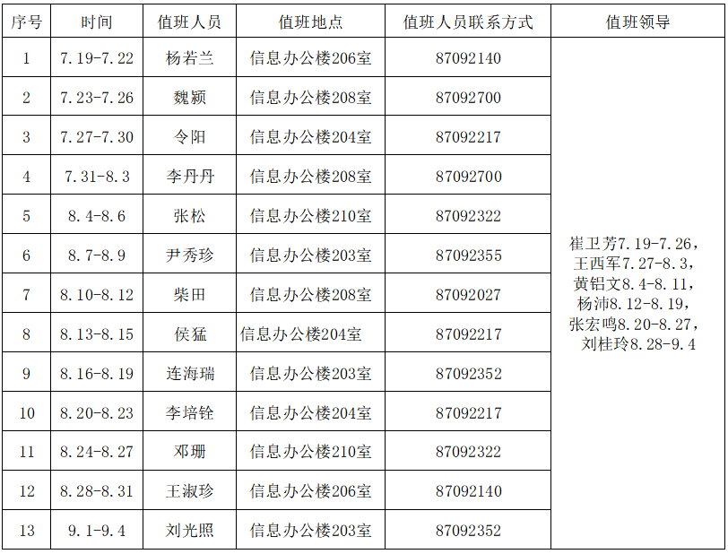 2.暑期合理安排轮休,确保各项工作有序运转,暑期值班时间为上午8:30-11:30,下午 3:00-6:00。暑期办公室值班及领导带班安排如下: