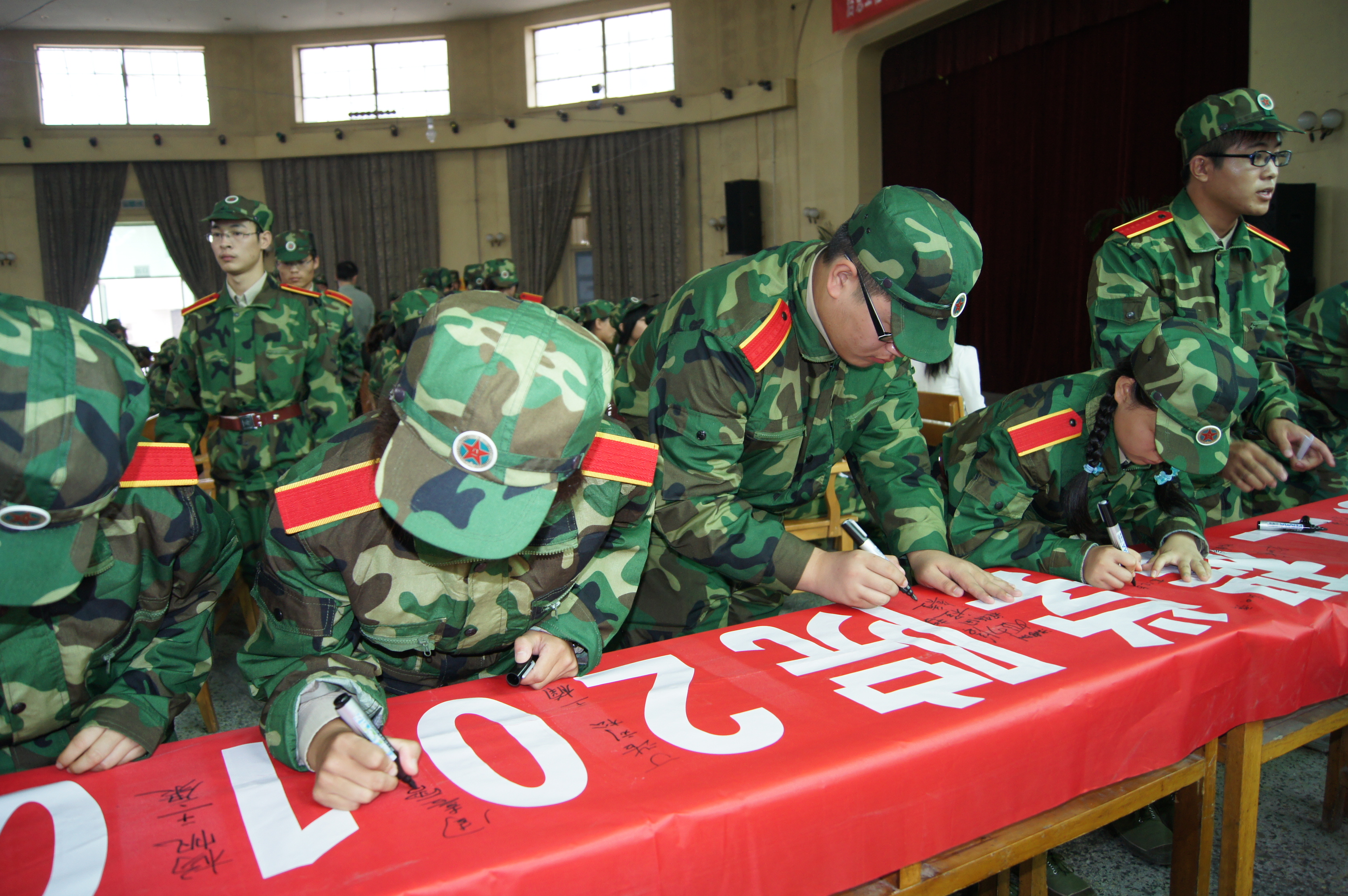 新生在争当优秀大学生横幅上签名