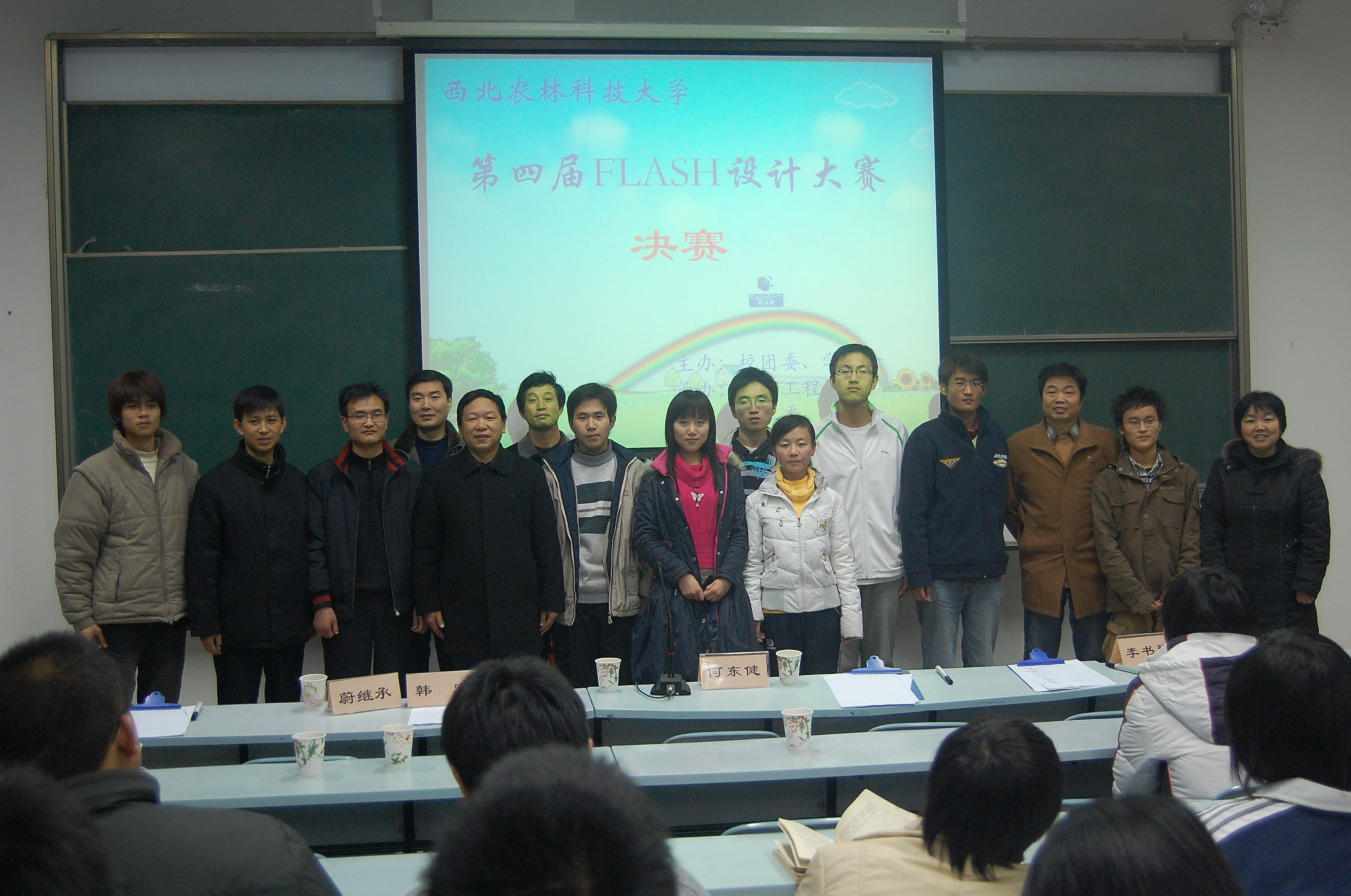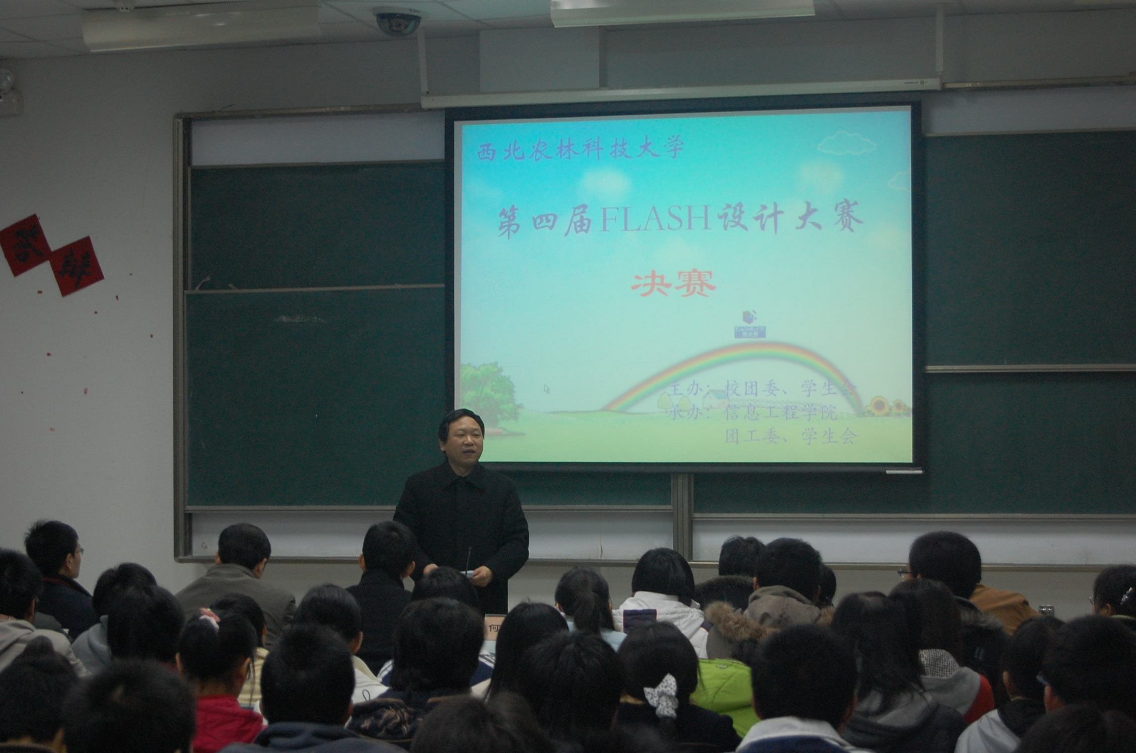 12月27日晚,我校第四届FLASH设计大赛决赛在信息工程学院多媒体教室如期举行,信息工程学院、校团委领导参加了决赛,信息工程学院院长何东健教授等五位专家担任评委。本次大赛由校团委主办,信息工程学院团工委承办,以流行金曲、校园生活、社会体验、卡通动画为作品题材,要求作品健康向上,充满活力,体现“激发学习兴趣,巩固专业知识”的活动宗旨。自9月份开始征集作品以来,共收到来自信息学院、食品学院、机电学院、水建学院、理学院、资环学院、动物科技学院、动物医学院、林学院等8个学院的30余件作品,经过初赛,共有10件作品进入决赛。