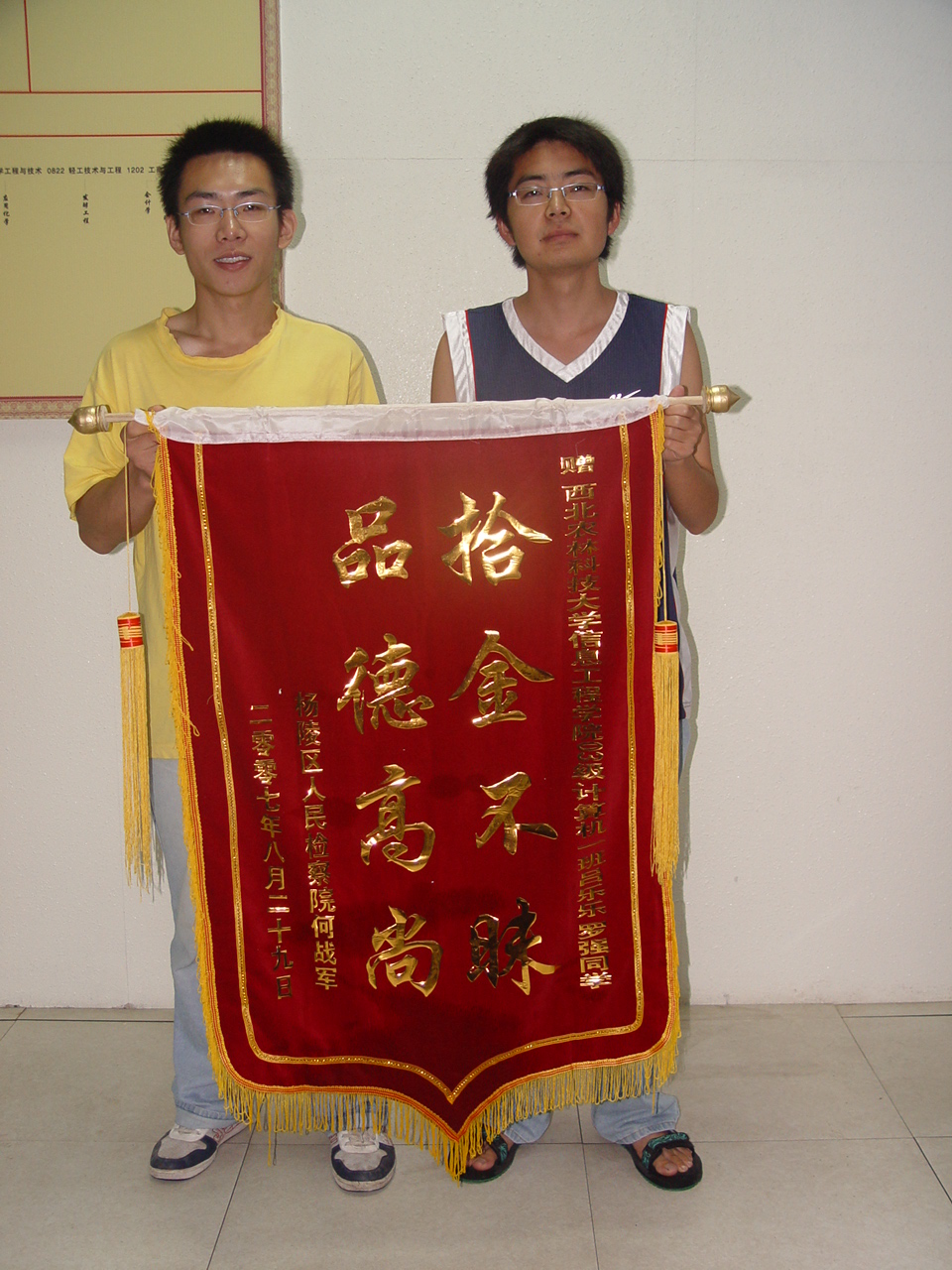 2007年8月30日上午,杨凌示范区检察院法警何战军、杨凌示范区检察院反贪局魏局长等一行三人来到信息工程学院对我院2003级计算机1班罗强、吕乐乐两位同学表示感谢。