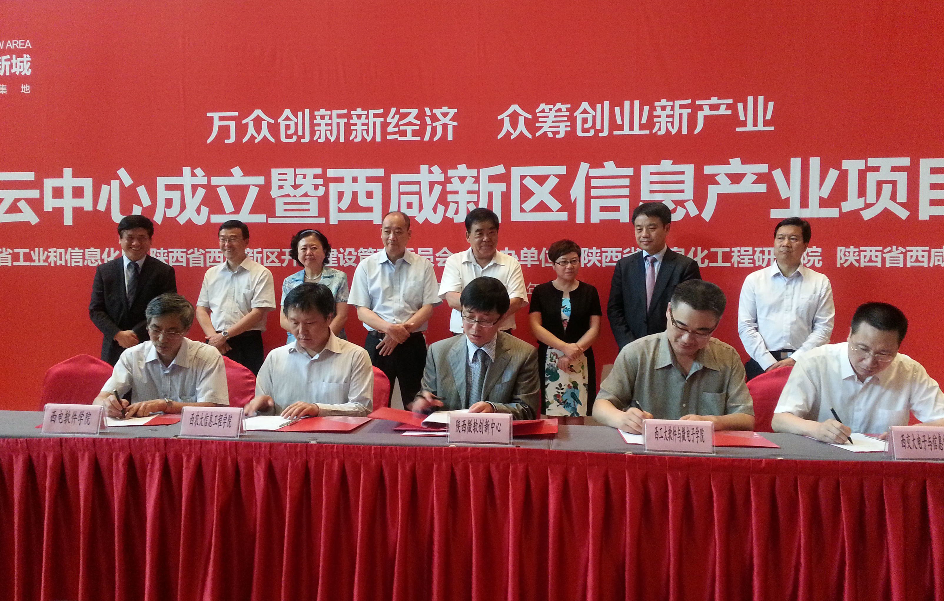 签约大会由沣西新城承办,在陕西大会堂召开,陕西省工业与信息化厅副厅长蔡苏昌,西咸新区管委会副主任、总规划师李肇娥,西咸新区管委会副主任、沣西新城管委会主任刘宇斌,中国联通陕西公司总经理谢国庆共同为工业云中心揭牌。