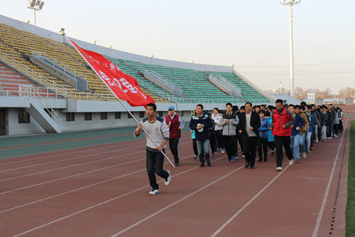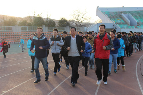 首先,宋西德教授做了长跑前的动员讲话,他希望同学们能积极参与体育锻炼,提高自身身体素质,强健体魄,践行“美丽中国梦”。随后杜养军老师和徐立国老师对同学们进行了思想动员和体育运动技能指导及冬季长跑中应该注意的事项。最后,党艳东老师致词并宣布冬季长跑活动开始。紧接着在宋西德书记、杜养军老师、徐立国老师、党艳东老师的带领下,同学们绕田径场慢跑五周,进行了第一次的长跑运动。为深入开展阳光体育冬季长跑活动,信息学院特制定活动实施方案,坚持学生长跑活动,落实阳光体育系列活动。
