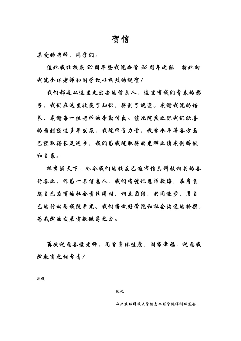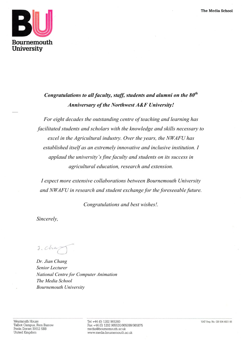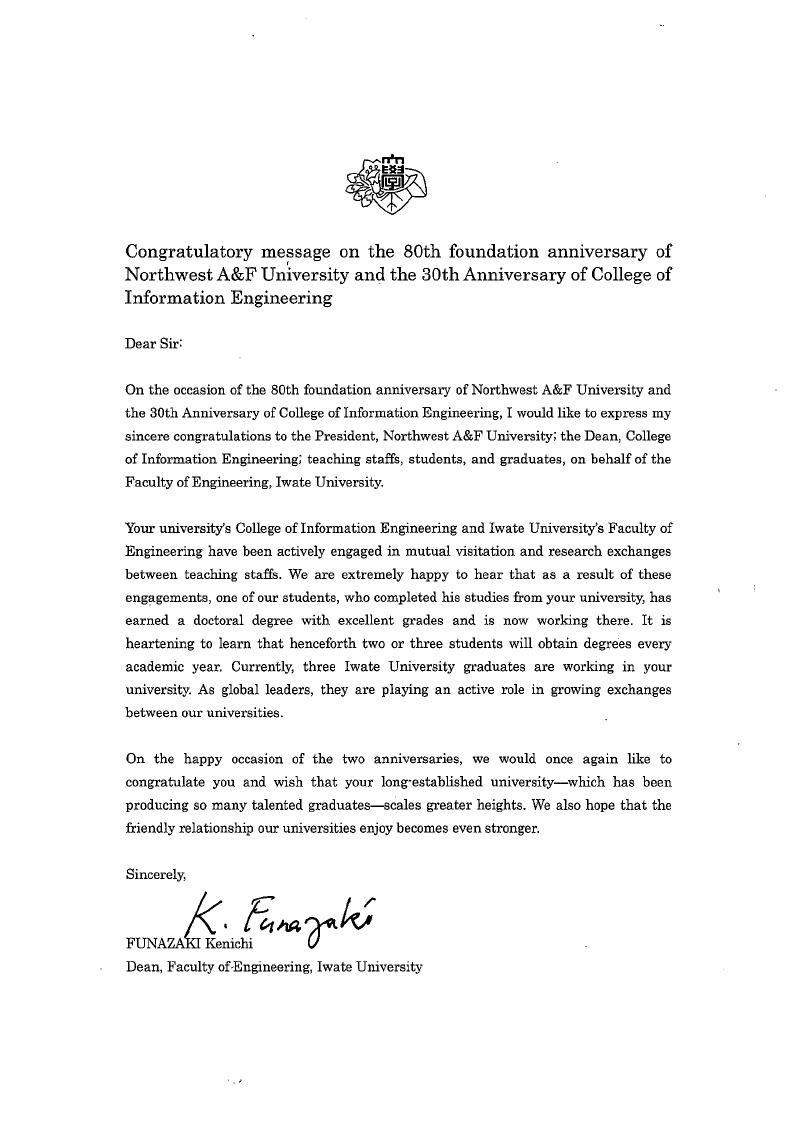 西北农林科技大学建校80周年合校15周年暨信息工程学院办学30周年之际,众多校友、兄弟院校、社会各界,以及国际友人纷纷发来贺信贺电,表达对西北农林科技大学校庆的热烈祝贺,对80年办学成就的肯定和赞扬,并对学校、学院的未来发展致以美好祝愿。