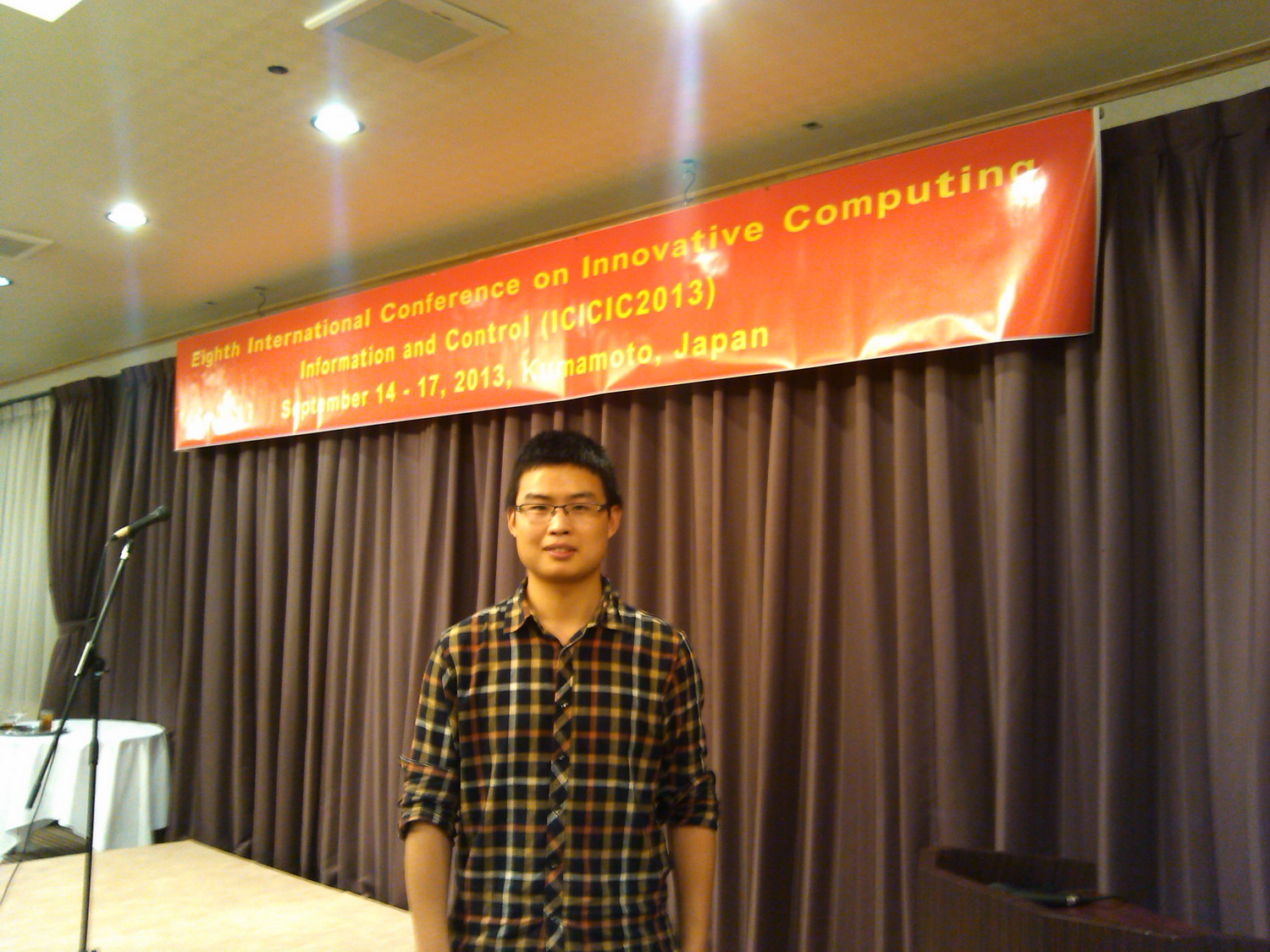 第8届创新计算、信息与控制国际学术会议(The Eighth International Conference on Innovative Computing, Information and Control, ICICIC2013)于2013年9月14日- 9月17日在日本熊本国际交流中心召开,会议由国际创新计算信息与控制学会(http://www.ijicic.org)和熊本东海大学主办。我院蔡骋副教授指导的2011级计算机应用技术专业的硕士研究生李永超的论文“Nondestructive Fuji Apple Internal Quality Classification with Dielectric Feature Selection”(基于介电特征选择的富士苹果内部品质无损分类)被该会议收录,并在大会主会场做了专题报告。