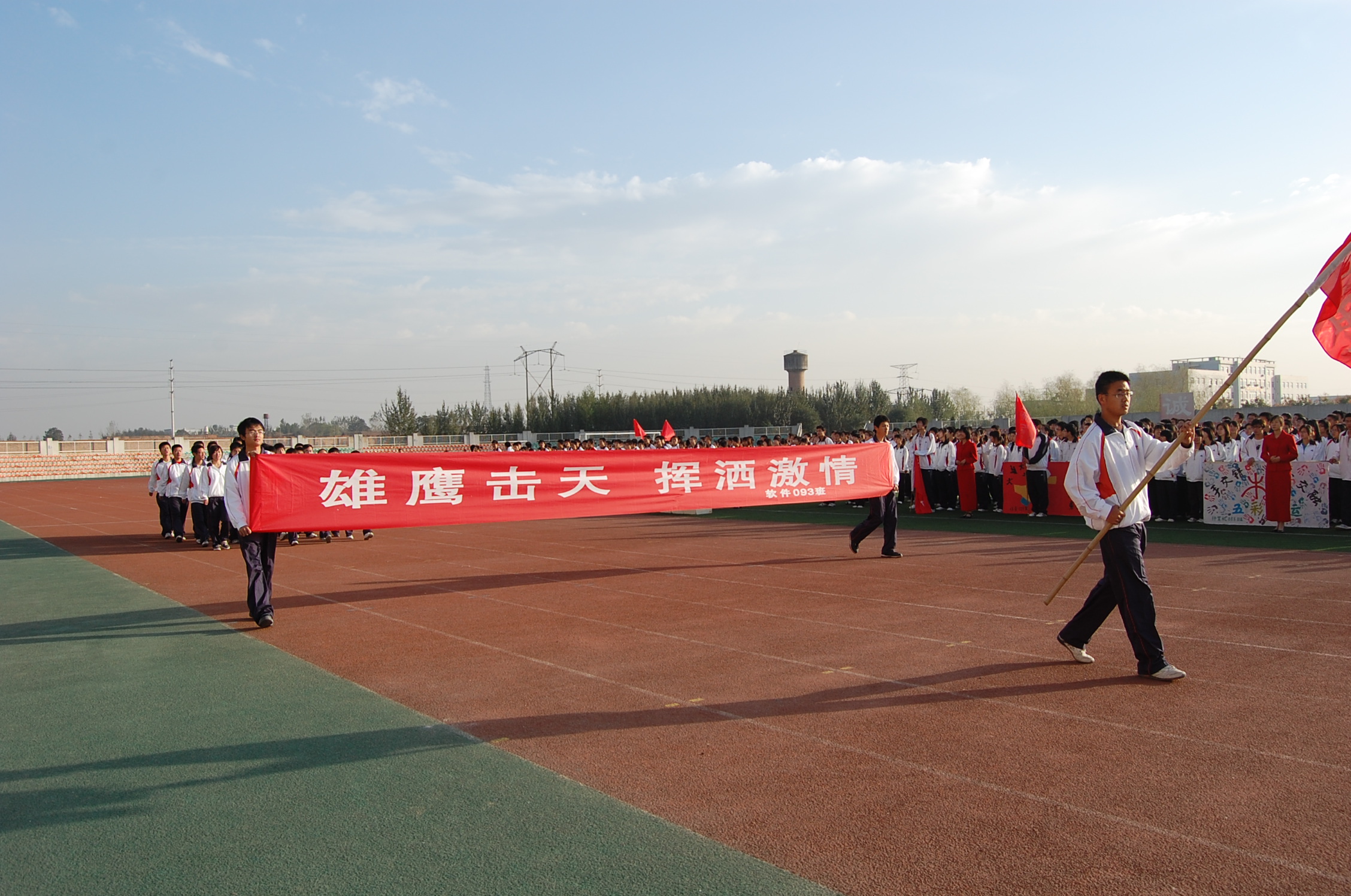 上午8点钟,运动会正式开始,08级和09级各方阵的同学们精神抖擞地入场。他们整齐的步伐、响亮的口号、创意的标语无不显示着他们积极向上的良好精神风貌。