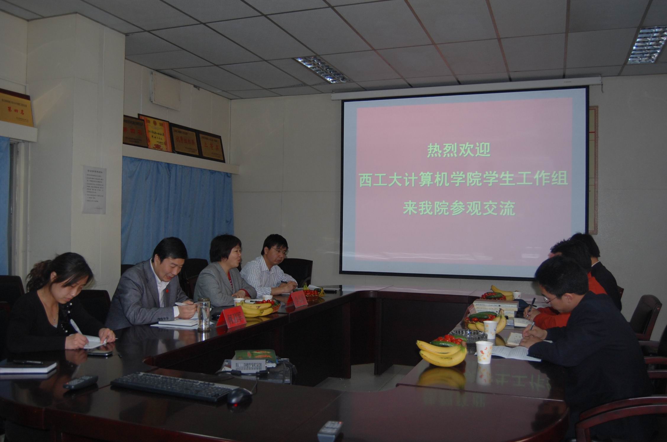 西工大计算机学院宫健副书记一行首先参观了学院计算机教学中心。学院在一层会议室召开了座谈会,会上,李书琴院长代表学院全体师生对西北工业大学计算机学院宫健副书记一行来院考察交流表示热烈欢迎,她介绍了学校和学院的历史和基本情况,以及学院学生工作的整体情况。学院党委副书记何卫军从专业设置、党支部设置、加强学风建设各项措施、团工委学生会开展的特色活动情况及学生工作取得的成绩等五个方面介绍了学院学生工作。西北工业大学计算机学院宫健副书记对我院学生工作开展情况及取得的成绩给予了很高的评价。双方就学生工作的工作经验和工作心得进行了深入交流,起到了相互借鉴,取长补短的作用。