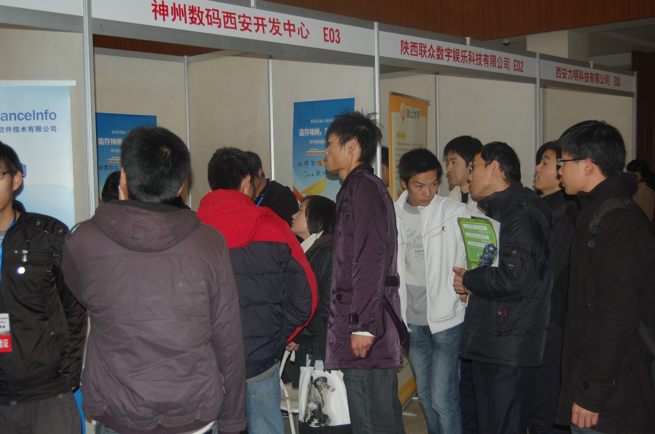 11月28日,学校在南校区秀山活动中心举行了2010届毕业生供需洽谈会,我院为这次洽谈会做了充分准备,自10月份以来,学院向往年招聘我院毕业生的40余家单位寄发了邀请函,学院党委副书记何卫军先后3次赴西安、1次赴上海、1次赴广东邀请用人单位,开辟就业市场,辅导员安中立赴北京参加了学校组织的2010届毕业生推介会,主管就业的辅导员还电话邀约落实参会单位,学院领导通过各种渠道邀请单位来院举行专场招聘会和参加大型洽谈会。经过多方努力,今年的毕业生供需洽谈会上,学院邀请到了陕西中盈蓝海创新技术股份有限公司、亚森西安亚森通信股份有限公司、西安力明科技、西安丝路软件有限责任公司、神州数码融信软件有限公司、西安三茗科技有限责任公司、西安朝阳医疗信息产业有限责任公司、联众电脑技术有限公司西安分公司、文思信息软件技术有限公司、西安软件园软件服务外包学院、华盛多媒体科技(西安)有限公司等13家单位,提供就业岗位60余个。