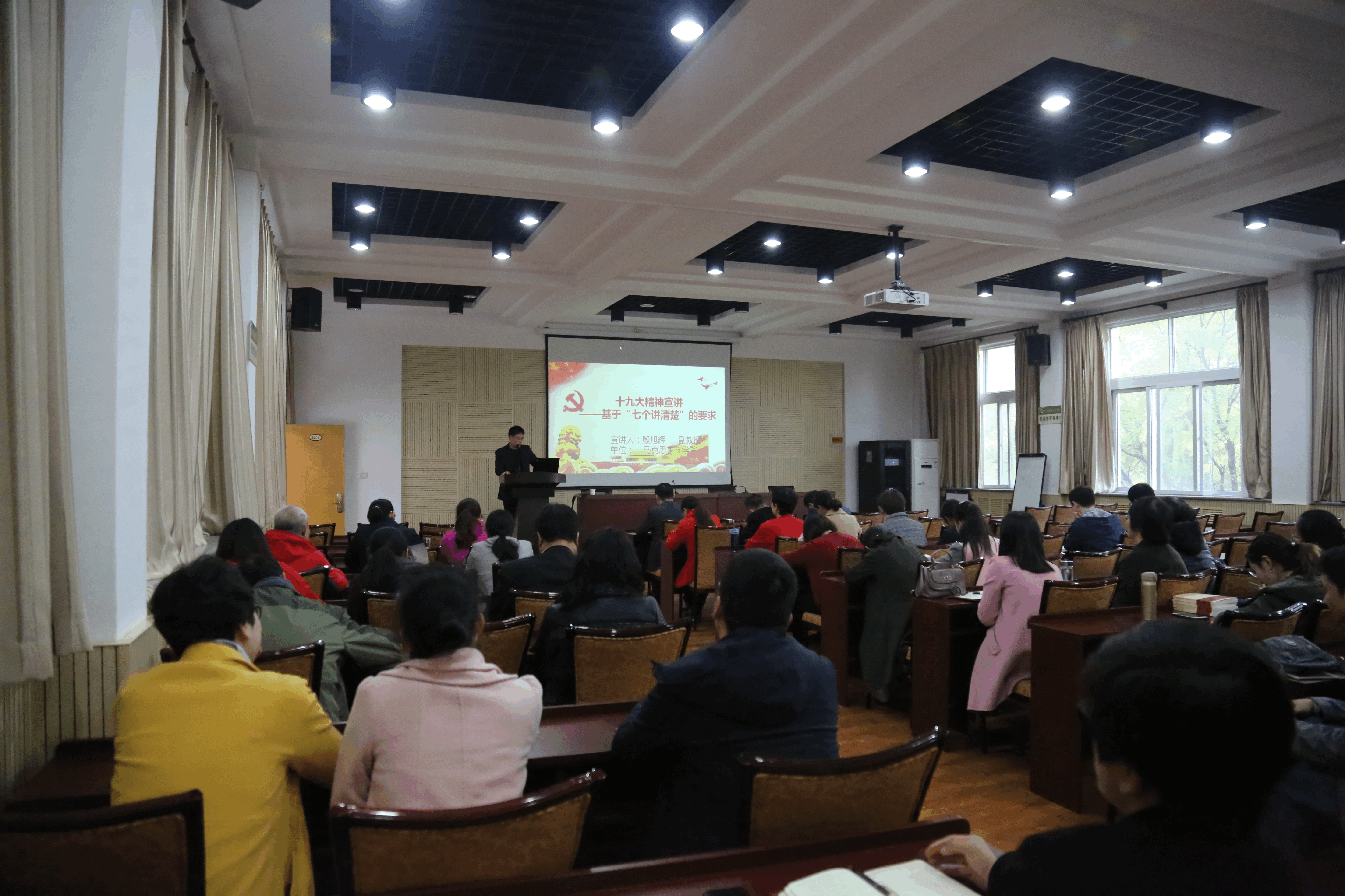 殷旭辉以《基于“七个讲清楚”的要求》为题,从党的十九大的鲜明主题、习近平新时代中国特色社会主义思想的丰富内涵、党的十八大以来党和国家事业发生的历史性变革、中国特色社会主义进入新时代的重大意义、我国社会主要矛盾变化的深远影响、两个一百年”奋斗目标、坚定不移全面从严治党的重大部署等七个方面为师生理清报告主线,以“初心”和“使命”为切入点详细的为我们解读了中国共产党的历史使命、“四个伟大”以及“三个意味着”、“八个明确”、党的建设总要求等新时代中国特色社会主义思想的内涵、意义和使命。