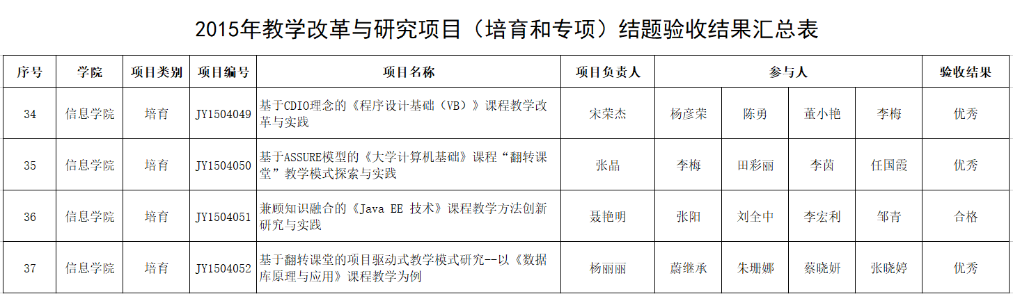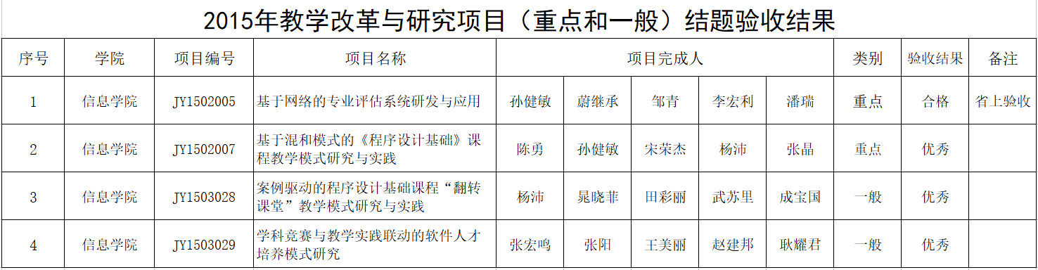 近日,学校《关于公布2015年校级教学改革与研究项目结题验收结果的通知》(办教发[2018]3号)公布了2015年校级教学改革与研究项目结题验收结果,共评出优秀69项,合格123项,不合格4项。我院申报的8项教学改革与研究项目,喜获优秀6项,合格2项。这是我院教师在教育教学改革研究方面取得的又一佳绩。
