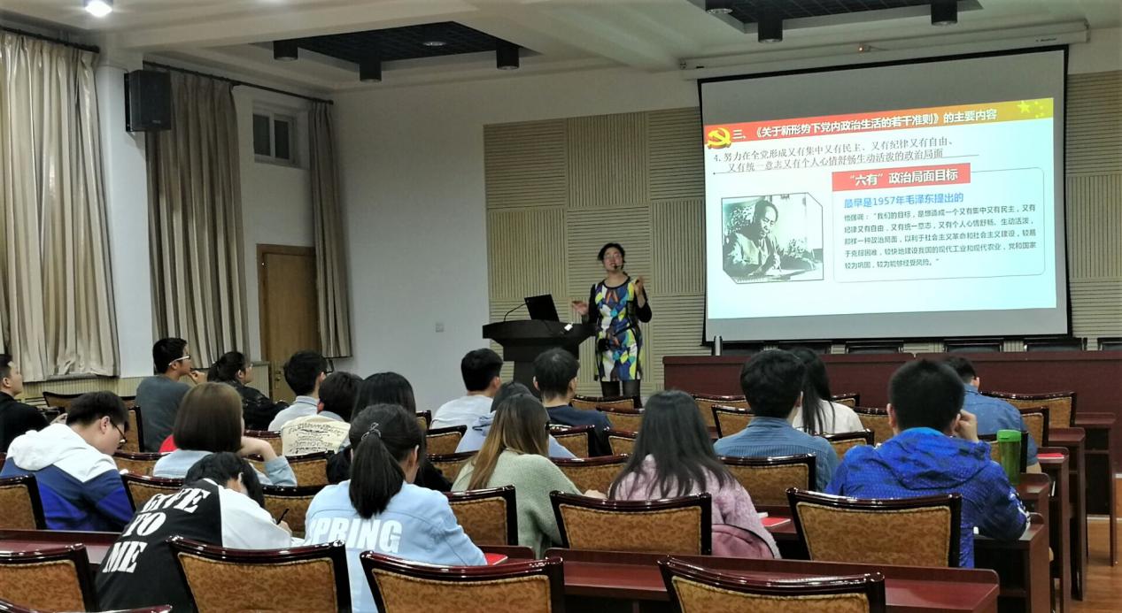 为进一步增强党内政治生活的严肃性,牢固树立规矩意识,提升学生党员的政治理论水平。4月17日晚,信息学院党委特邀马克思主义学院张丽副教授为学生们做专题报告,本次报告围绕《新形势下党内政治生活若干准则》展开,全体发展对象及拟转正预备党员参加。