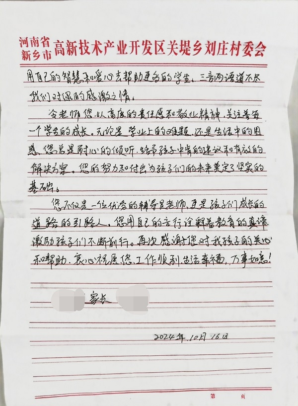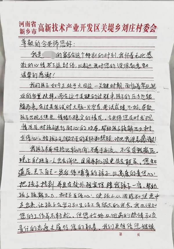 “令阳老师在凌晨放下自己一岁多哺育的孩子,毅然前来帮助我的孩子。您不仅是一位优秀的辅导员,更是孩子们成长路上的明灯,您用言行诠释了教育的真谛,激励孩子们不断向前!”近日,信息学院收到了一封感人至深的感谢信,信中2021级软件小唐(化名)的母亲用朴素平实的语言讲述了,学院辅导员令阳对其孩子无微不至的关怀和照顾,字里行间满是感激之情。