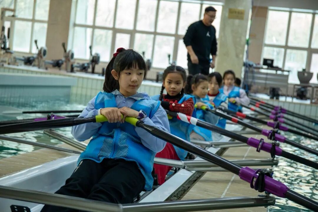 研学之旅的最后一站——体能中心的热血时刻如期上演。孩子们上手操作国家队同款赛艇训练机,感受水上运动的独特魅力;室内橄榄球课上,在教练的指导下学习规则、参与趣味游戏,奔跑、传球、防守,活力满满。