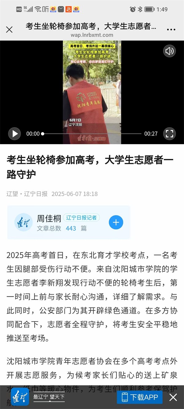 6月7日,高考第一天,沈阳城市学院青年志愿者团队以饱满的精神状态,为考生及家长提供全方位助考服务。期间,我校志愿者送行动不便考生进考场的暖心事迹,被新华社和辽宁日报报道,截至目前,全网阅读量已破百万。我校志愿者团队的“爱心护考”志愿服务行动,也被辽宁交通广播、辽沈晚报、沈阳广电云盛京、共青团沈阳市委员会“青春沈阳”等媒体相继报道。