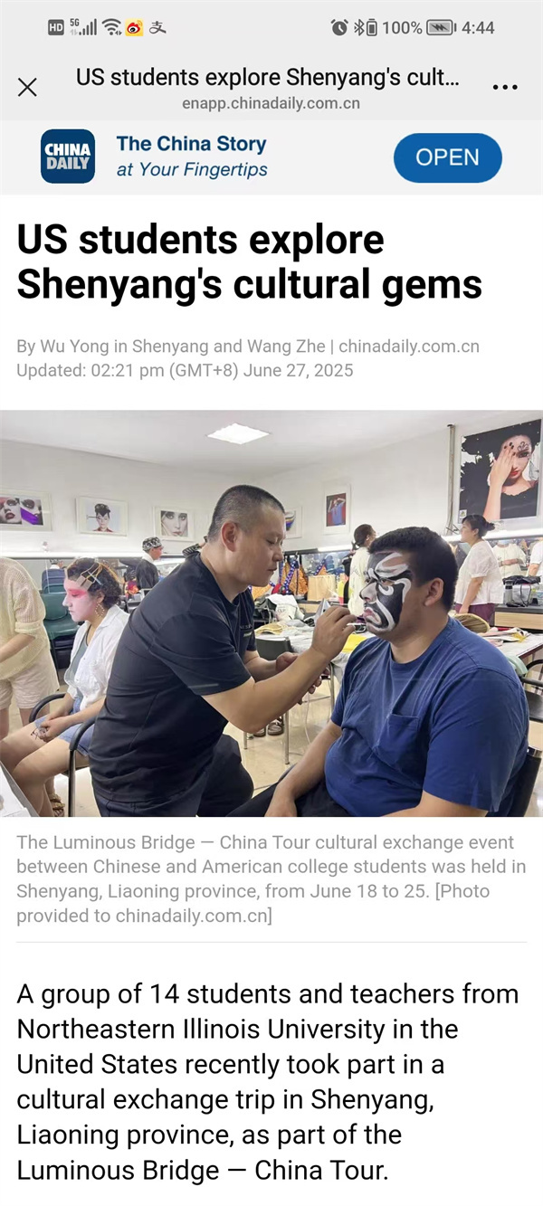 624日,“光影之桥——美国东北伊利诺伊大学艺术学院师生中国行”结束了在辽宁省沈阳市的活动。在历时7天的时间里,沈阳城市学院与美国东北伊利诺伊大学的学生联合采风,进行文体交流。中美大学生通过“青春对话”,结下了深厚友谊。