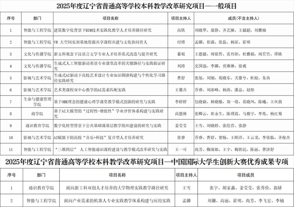 近日,辽宁省教育厅正式公布2025年度辽宁省普通高等教育本科教学改革研究项目立项结果,我校共有13个项目成功获批立项。其中,一般项目11项、中国国际大学生创新大赛优秀成果专项项目2项,这是学校在本科教育教学改革领域研究实力与实践成效的集中体现,也是我校持续深化教育教学改革、推进应用型人才培养的又一重要成果。辽宁省普通高等教育本科教学改革研究项目是我省高等教育教学改革的重要载体与核心平台,本次立项聚焦数字化转型、人工智能赋能、新文科建设、产教融合、双创教育等高等教育改革重点方向,汇聚了全省高校在教学模式创新、课程体系优化、人才培养范式革新等方面的最新研究成果和实践经验。