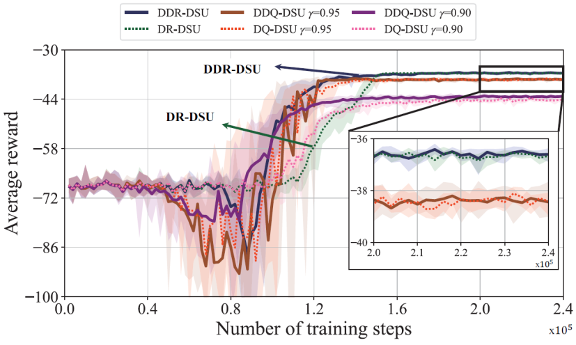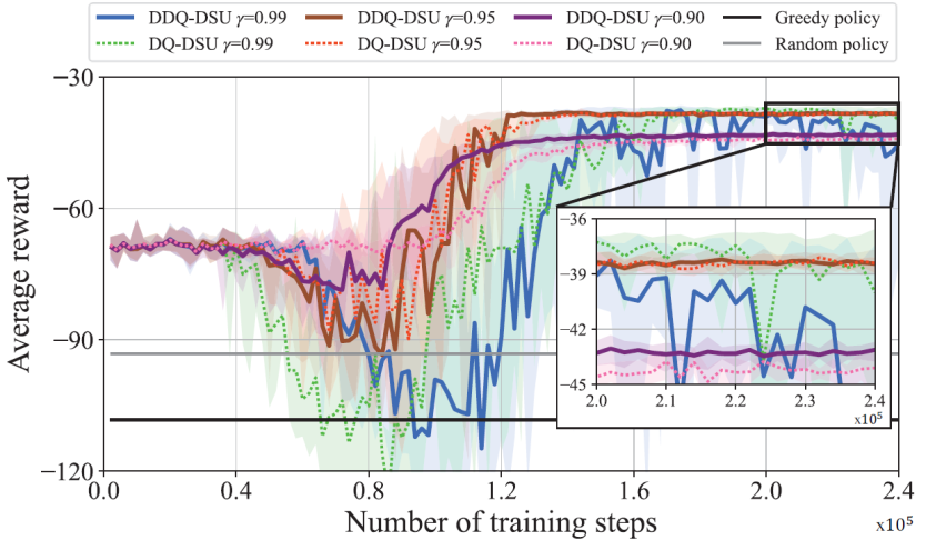 针对上述问题,本研究进一步综合考虑了物联网中用户数据请求以及网络传输状况难以提前预知的实际情况,并利用信息年龄(Age of Information,AoI)作为数据新鲜度的衡量指标,将边缘缓存增强型物联网中的缓存数据动态更新问题建模为一个基于非等长时间步的动态优化问题。进而,首次提出结合了已有深度强化学习算法与R-learning算法的算法设计架构,并提出了一类新型的深度强化学习算法。与以优化长期折现累积回报(discounted long-termcumulative reward)为目标的传统深度强化学习算法不同,所设计算法可以在有效解决维度灾难和环境动态未知等问题的同时,优化所获得的长期平均回报(long-termaverage reward),有效提升所关注动态决策系统的实际性能。相较于五种基于传统深度强化学习算法和策略,所设计算法在有效性、收敛性和稳定性方面均具有明显的性能提升。