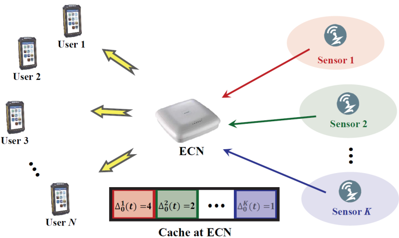 实时物联网中,利用边缘缓存技术可以在满足用户数据请求的同时,降低传感器的激活次数和工作时长,有效提升网络生存期(lifetime)。然而,如果无法对边缘节点所缓存的数据内容进行及时更新,用户设备所获取数据的新鲜度将会发生恶化,并最终影响相关决策的准确性和可靠性。