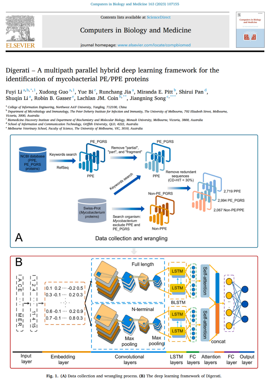 近日,我院智能计算与农业信息系统学科团队李富义教授课题组在期刊《Computers in Biology and Medicine》(数学与计算生物学小类一区、工程技术大类二区期刊,2022年影响因子为6.698)上发表题为“Digerati—A multipath parallel hybrid deep learning framework for the identification of mycobacterial PE/PPE proteins”的最新研究成果。西北农林科技大学信息工程学院为该论文第一作者单位,李富义教授为通信作者和第一作者,课题组助研郭旭东为论文共同第一作者。