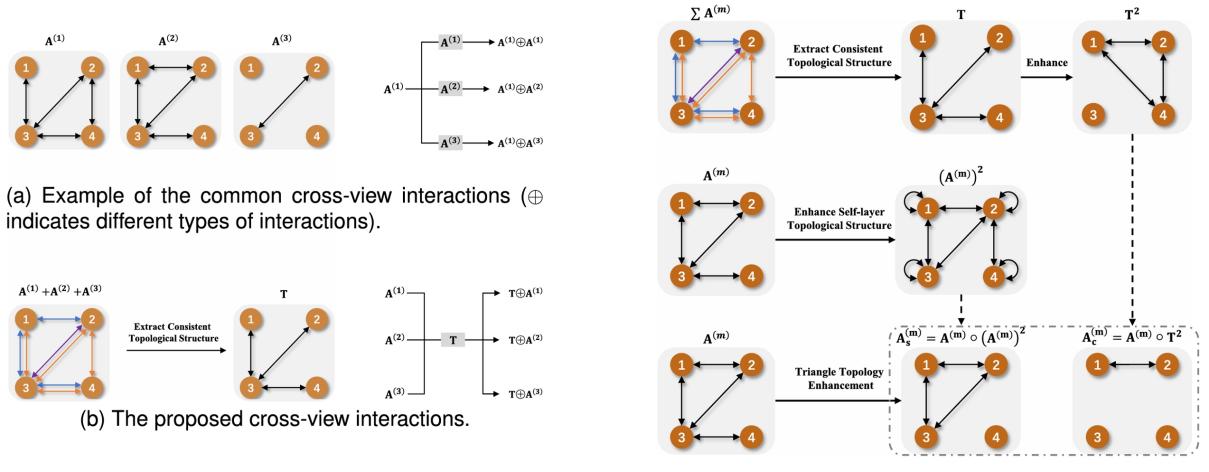 该研究工作探索了高阶拓扑结构交互下的多图表征学习与聚类算法,其核心思想是基于一致性框架下的层内交互及层间交互方法对原始拓扑结构进行增强,随后基于简单的图注意力机制实现了多图场景下的信息传递及聚类功能。实验结果显示,所提出的方法在多个基准数据集上取得了较好的性能。