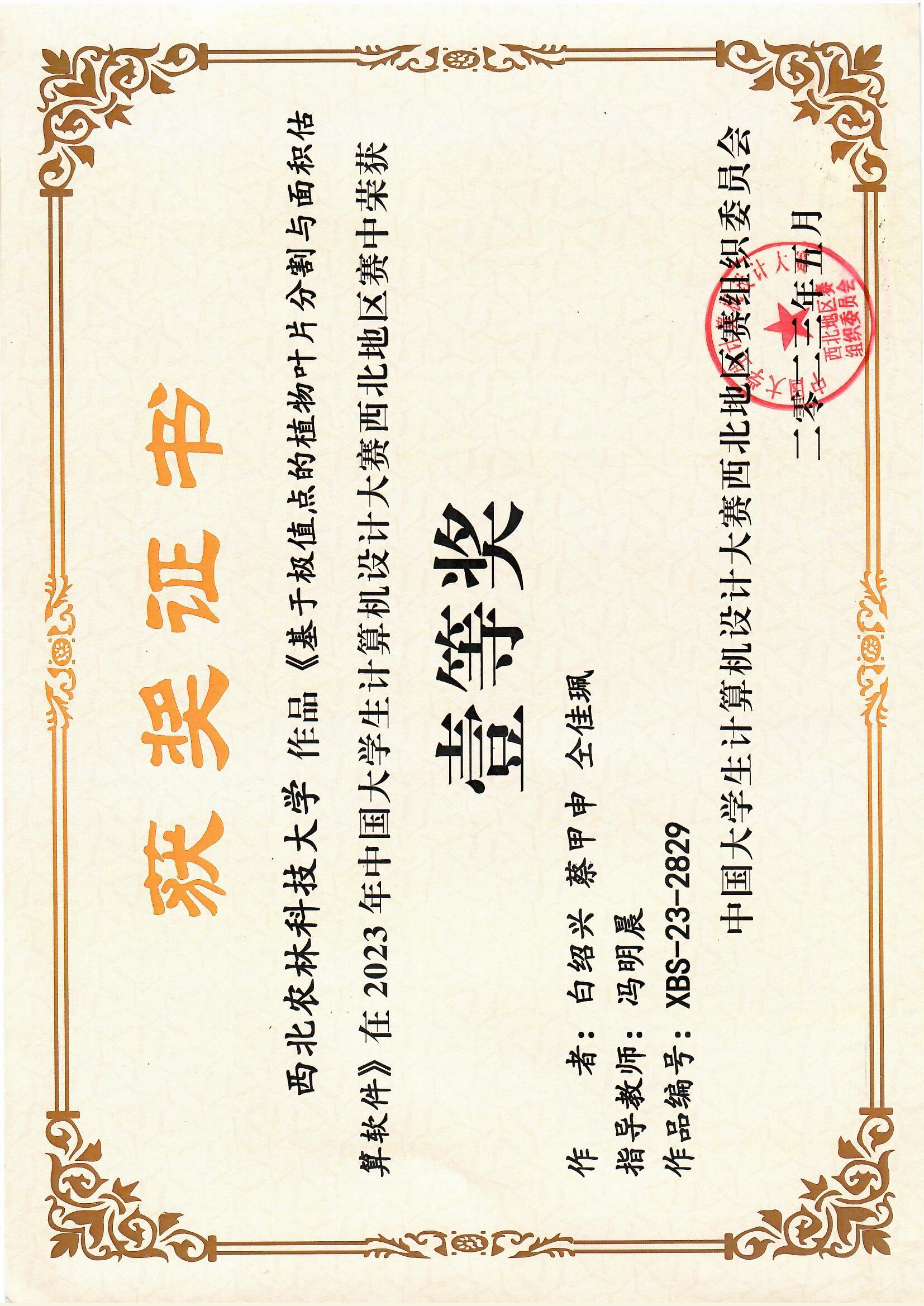 白绍兴 蔡甲申 仝佳珮 《基于极值点的植物叶片分割与面积估算软件》获2023年中国大学生计算机设计大赛西北赛区“一等奖”,并推荐参加国赛。