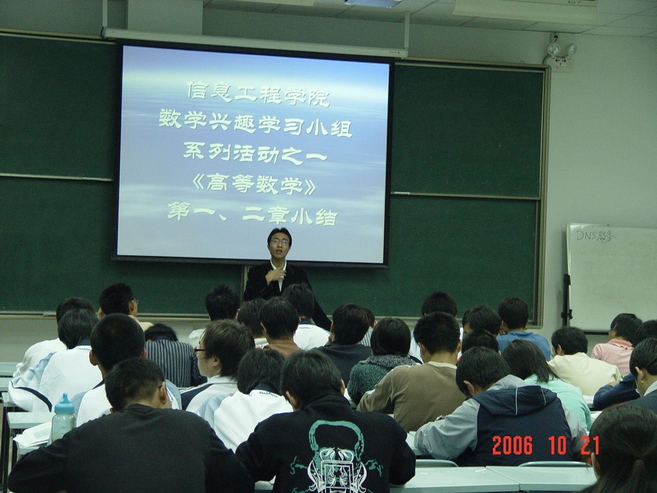 10月21日晚在学院多媒体教室M2为2006级100多名数学兴趣学习小组成员开展了高数第一.二章专题小结讨论活动。本次讨论学习由辅导员贺鹏老师主讲,他将抽象的基础理论讲授得非常生动形象,而且将集合.极限.微积分等重难点与哲学思辨的人文精神紧密结合,给学生带来了耳目一新的感觉。学习现场气氛热烈,学生参与积极,形成了很好的互动场面,这将大大促进新生关于高等数学的学习。(学生工作办公室)