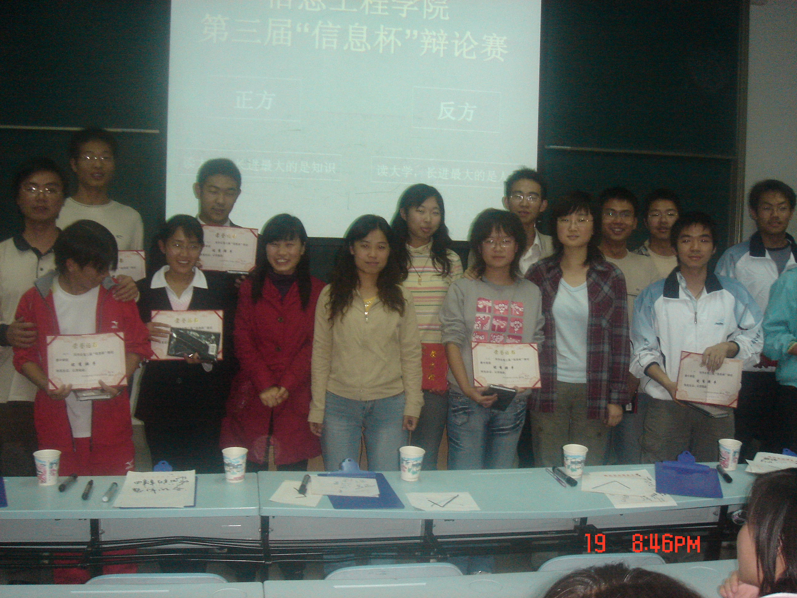 为丰富我院文化生活,促进全院各班、各年级的交流,提高我院学生在思辨力、语言表达以及思维严密性等方面的素质,信息学院第三届“信息杯”辩论赛于2006年10月9日拉开帷幕,经过十五场激烈的角逐,于2006年10月19日圆满结束。