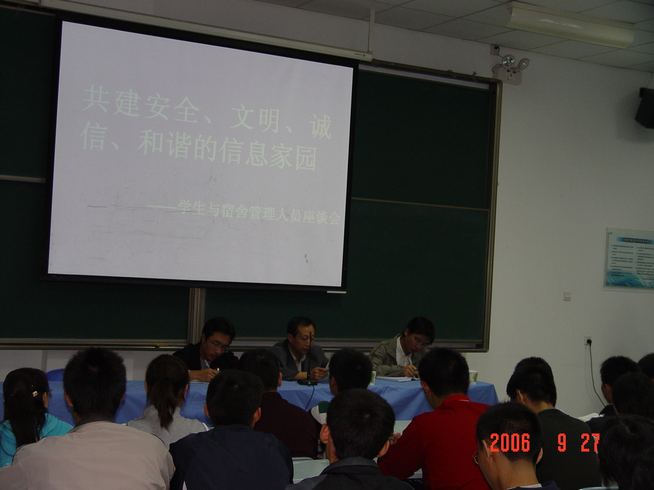 9月27日晚,信息学院在计算机教学中心三楼多媒体教室M1召开以“建设安全、文明、诚信、和谐的信息家园”为主题的师生与宿舍管理人员座谈会,座谈会由2006级辅导员谷申杰老师主持,北校区西区学生宿舍管理中心张大生老师、辅导员贺鹏以及100名学生代表参加了座谈会。