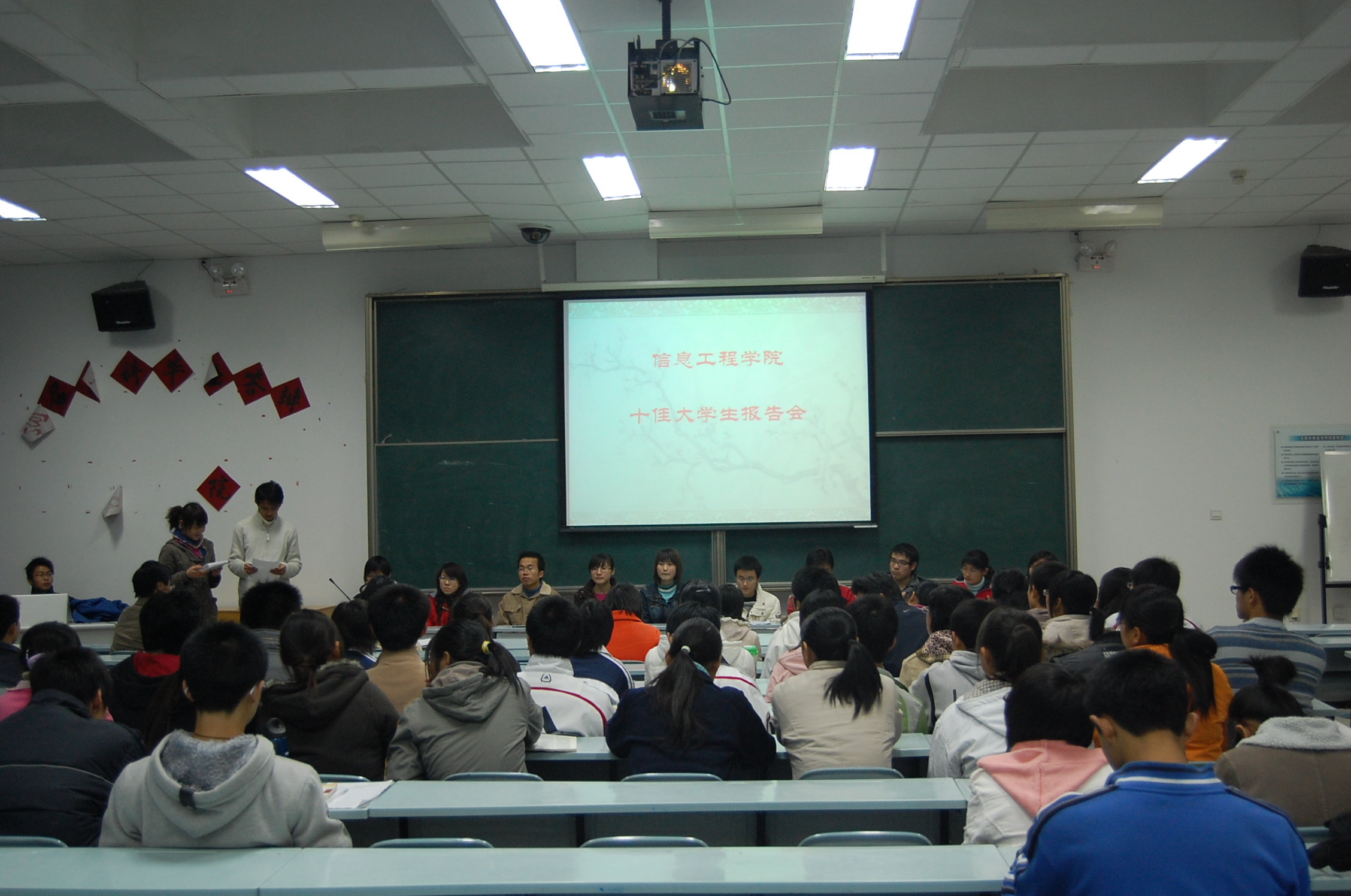 12月3日晚7:30,信息工程学院“十佳大学生”报告会在多媒体教室M1拉开帷幕,百余名新生到场听取。