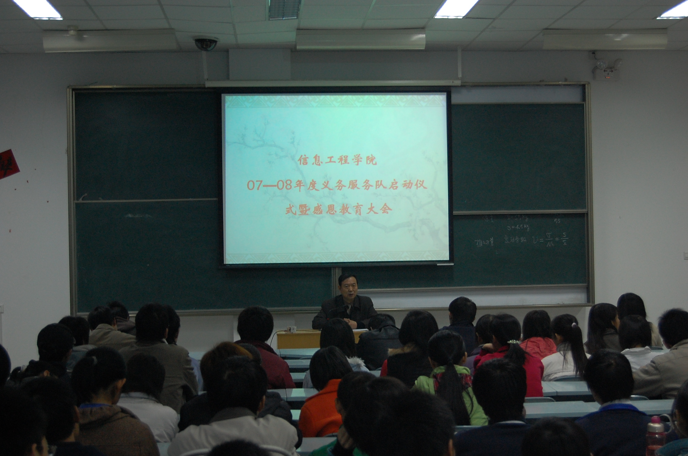 11月30日下午,信息工程学院召开了2007?2008学年度大学生义务服务队启动仪式暨感恩教育大会。信息工程学院党委书记樊世明老师、辅导员谷申杰老师、王淑珍老师以及250余名队员代表参加了教育大会。