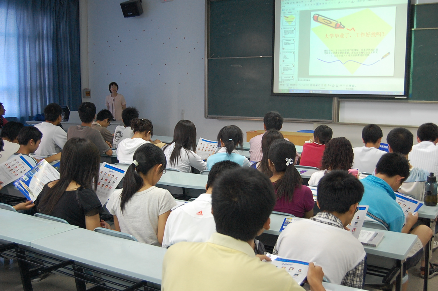 张经理从计算机发明历史谈起,讲到计算机的发展和应用,从计算机产品的特点讲到国内外产品开发所用的主流工具。并重点讲解了C/C++的四点应用,一是利用其高效的编译方法,用于图形图像开发;二是网络开发;三是多媒体开发;四是系统开发。张经理还讲到了软件行业的发展前景,她说IT行业与传统行业相比的优势明显,行业收入高、工作环境好、体现个人能力,是一个聪明人的行业。同时她说IT企业招聘的要求高,要求毕业生具有扎实的基本知识,较强的实践能力、较好的外语以及良好的综合素质,她希望大家在学校期间抓住一切机会好好学习,不断增加自己的求职砝码。