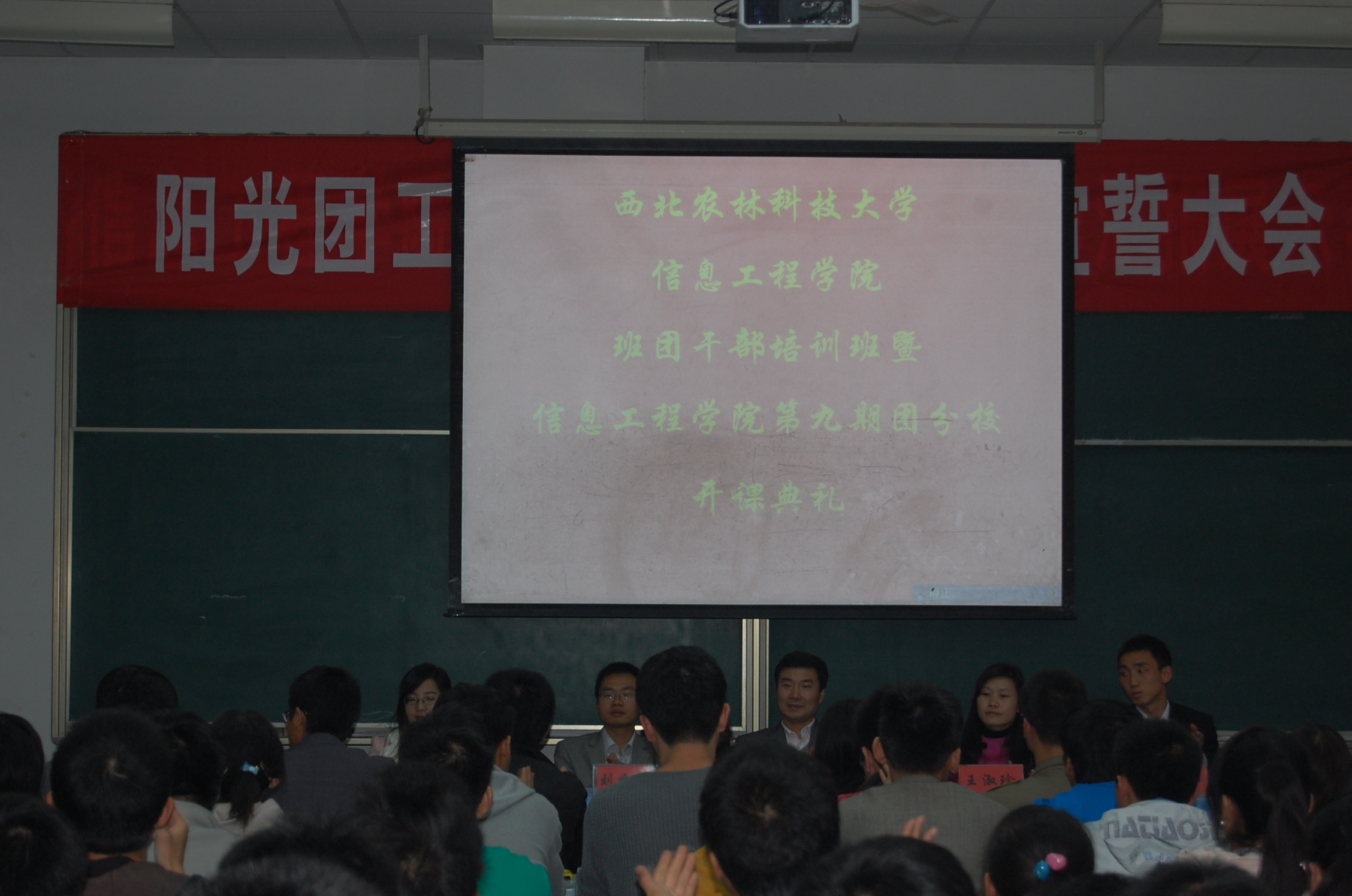 10月30日晚7点30,信息学院在M2教室举行了班团干部培训班暨第九期团分校开课典礼。信息学院党委副书记何卫军老师、校团委社会实践部部长刘业兴老师、院学工秘书王淑珍老师、团工委书记桂恺老师、辅导员倪玲老师、仵亚伟老师,及各兄弟院系的团工委书记、副书记、组织部长出席了此次大会。