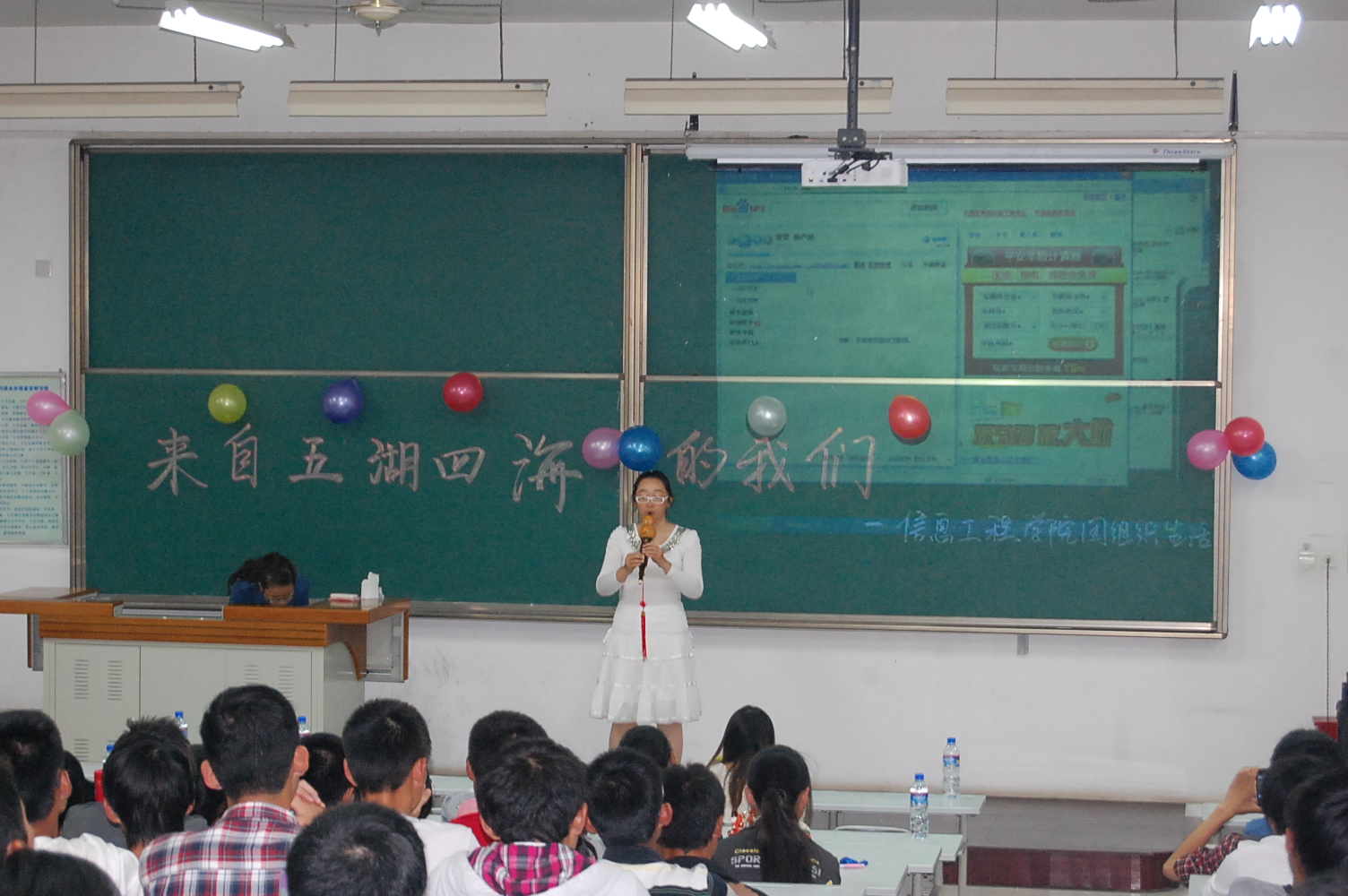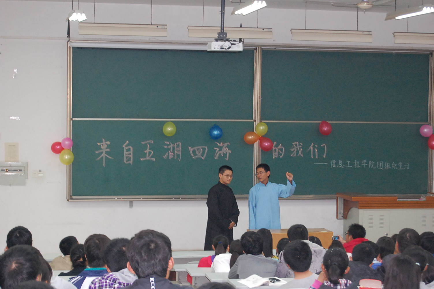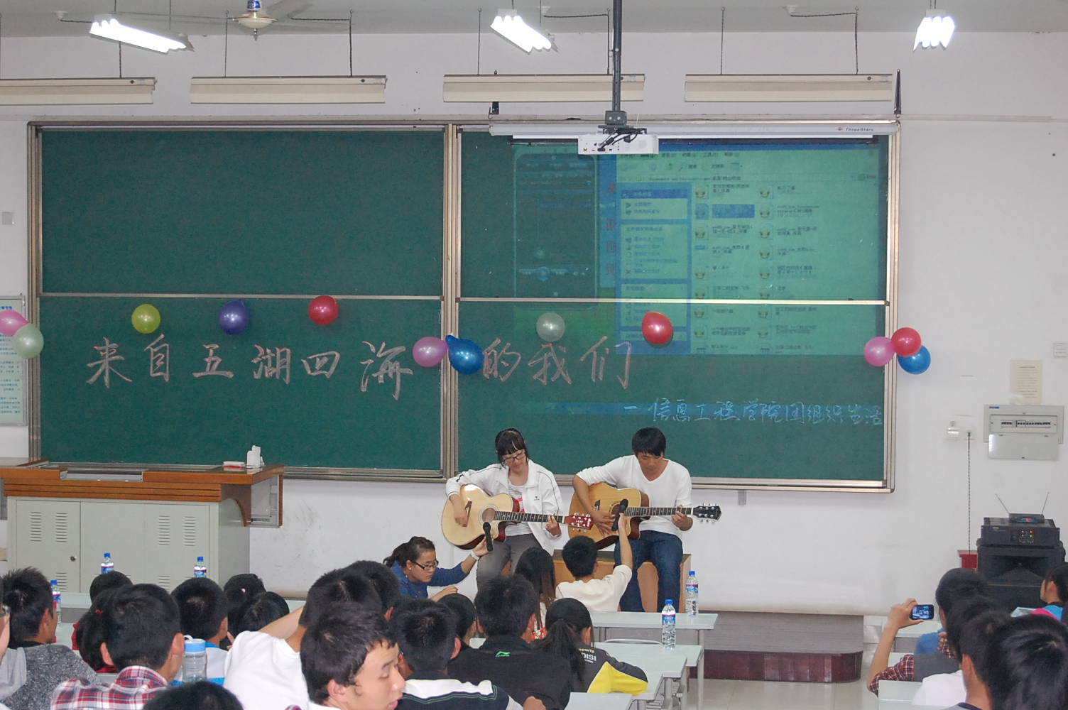 9月25日晚7点半,信息学院在8T阶梯教室举行了2012级新生迎新晚会。团工委书记桂恺、辅导员倪玲、仵亚伟、郭峰来到活动现场观看晚会。