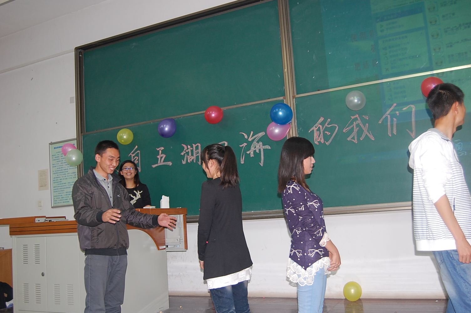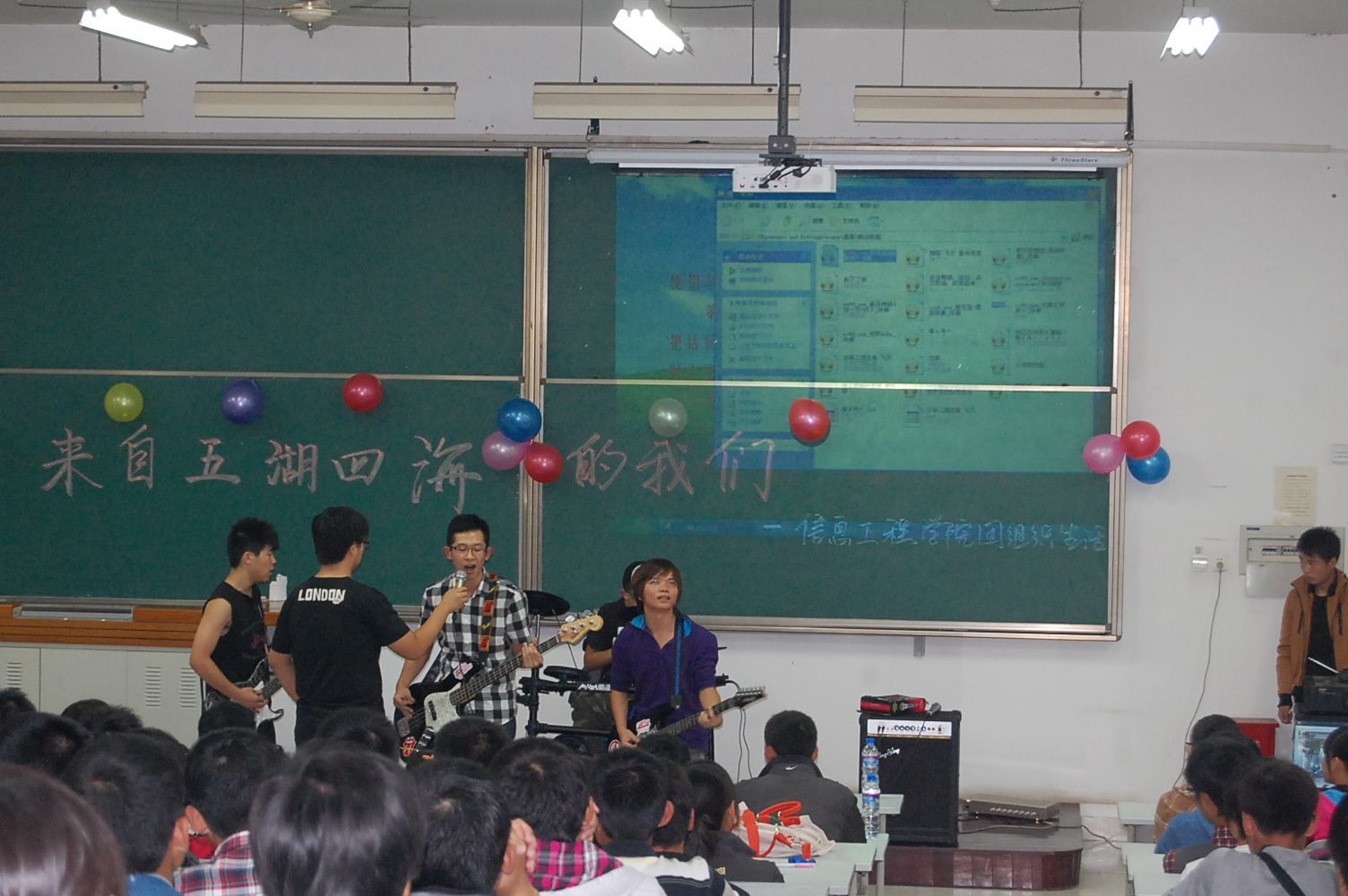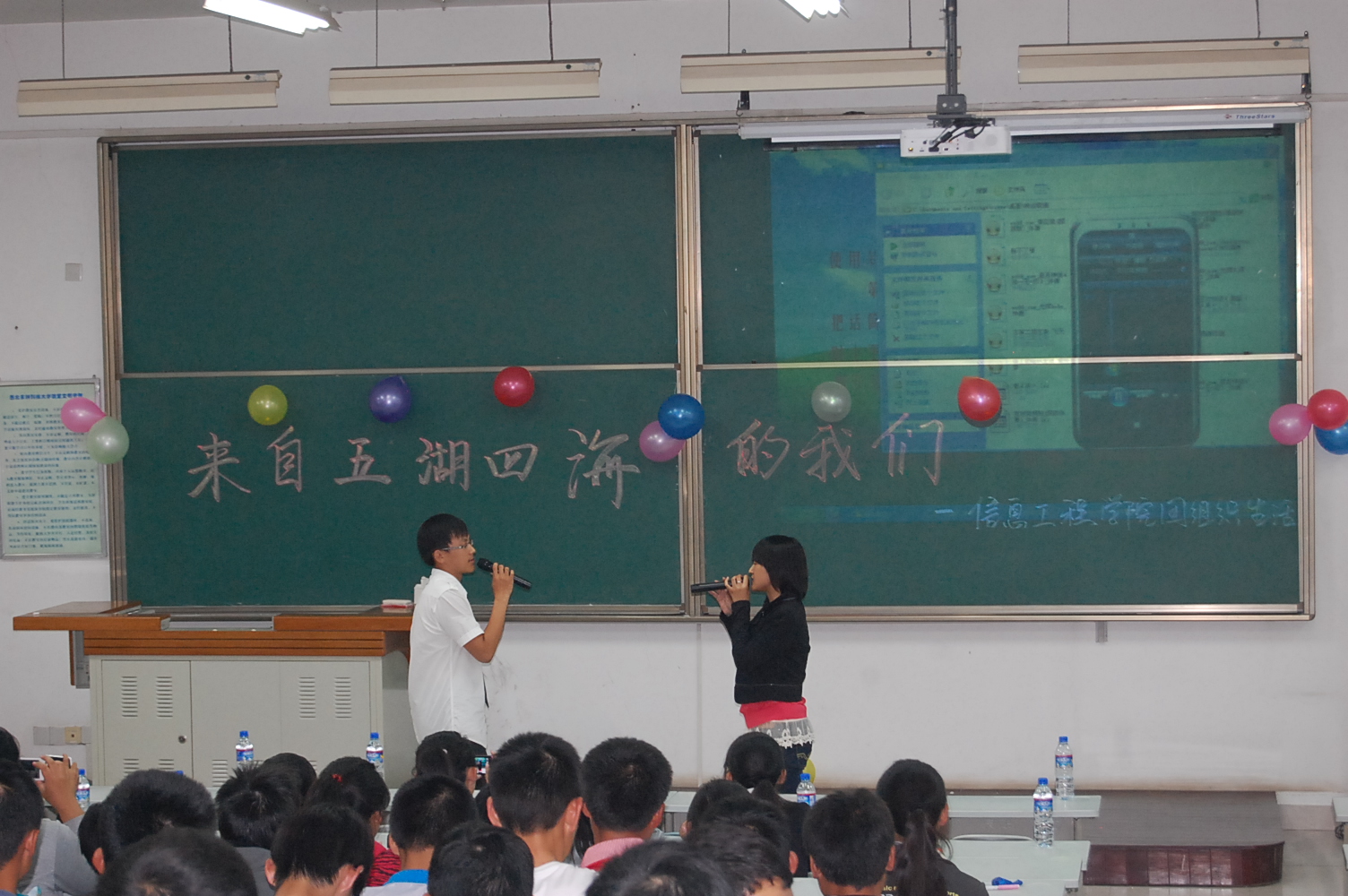 9月25日晚7点半,信息学院在8T阶梯教室举行了2012级新生迎新晚会。团工委书记桂恺、辅导员倪玲、仵亚伟、郭峰来到活动现场观看晚会。