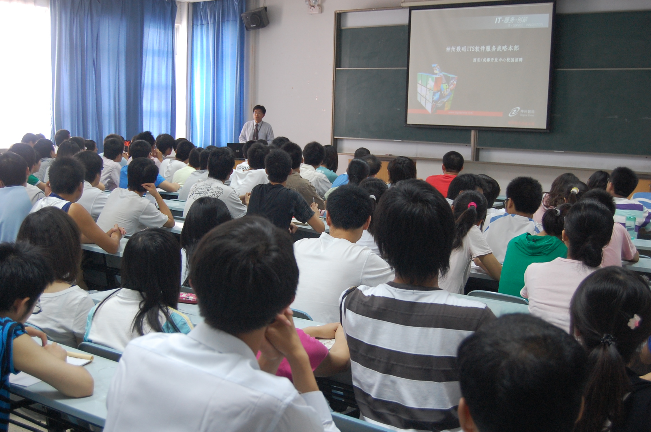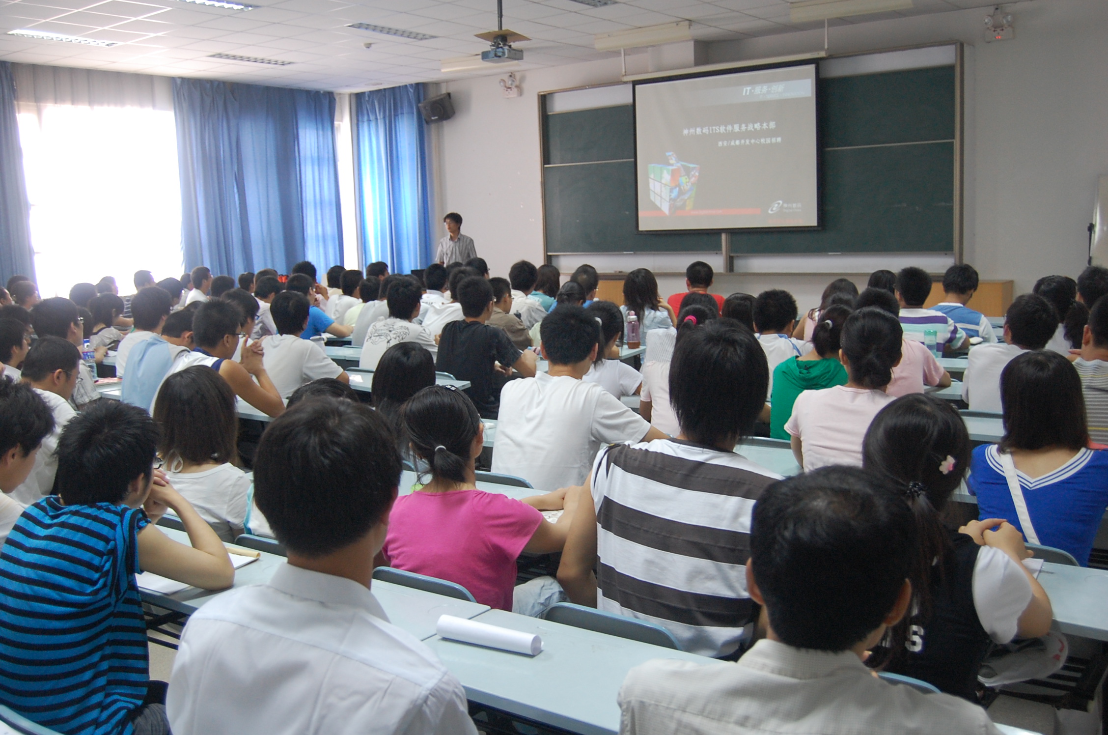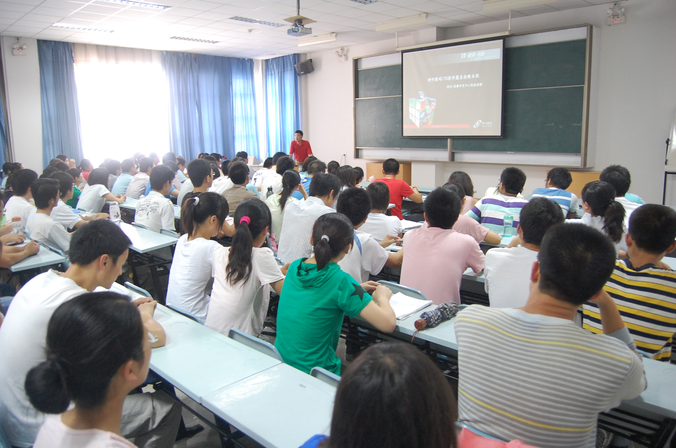 何卫军副书记首先对北京神州数码融信软件有限公司西安分公司两位经理的到来表示欢迎。他指出,神州数码是一家实力强劲的IT公司,从2008年3月与我院签订建立就业实习基地协议以来,同我院建立了良好的合作关系,为我院学生提供了大量的实习岗位并录用了很多优秀实习生,仅05级就录用了13名本科生和2名研究生,月薪都在3000元以上。因此,何书记希望同学们能把握住这次实习机会,争取毕业时能成为该公司的正式员工。随后,汪少祥经理向大家介绍了公司的规模、岗位设置、职业发展以及实习内容等;折沂经理介绍了此次招聘的流程,她表示公司将为所有实习生提供免费培训并发放一定生活补助,表现优异的学员在毕业时将直接与公司签订三方协议和劳动合同。最后,05级部分进入神州数码工作的同学与全体同学一起进行了交流。
