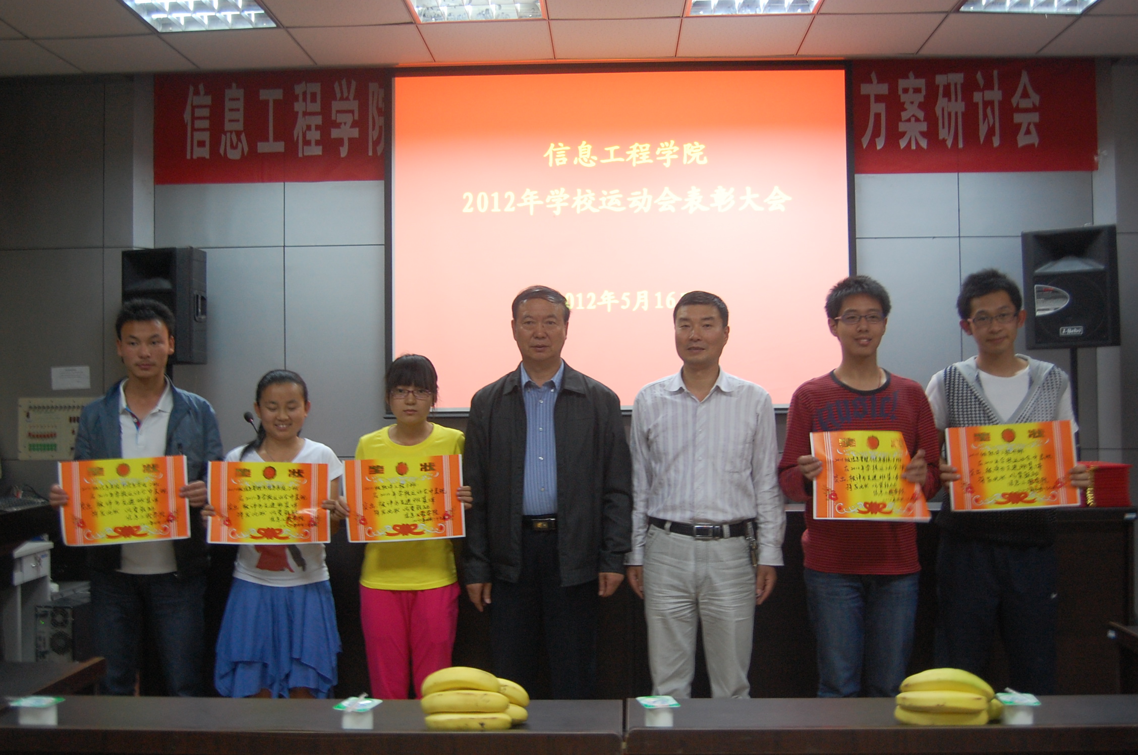 5月16号晚7:30,信息学院在二层会议室举行校运动会表彰大会,对先进班集体、优秀运动员、优秀学生干部、优秀通讯员等做出表彰。院党委书记樊世明,党委副书记何卫军出席会议,会议由院学工秘书王淑珍老师主持。