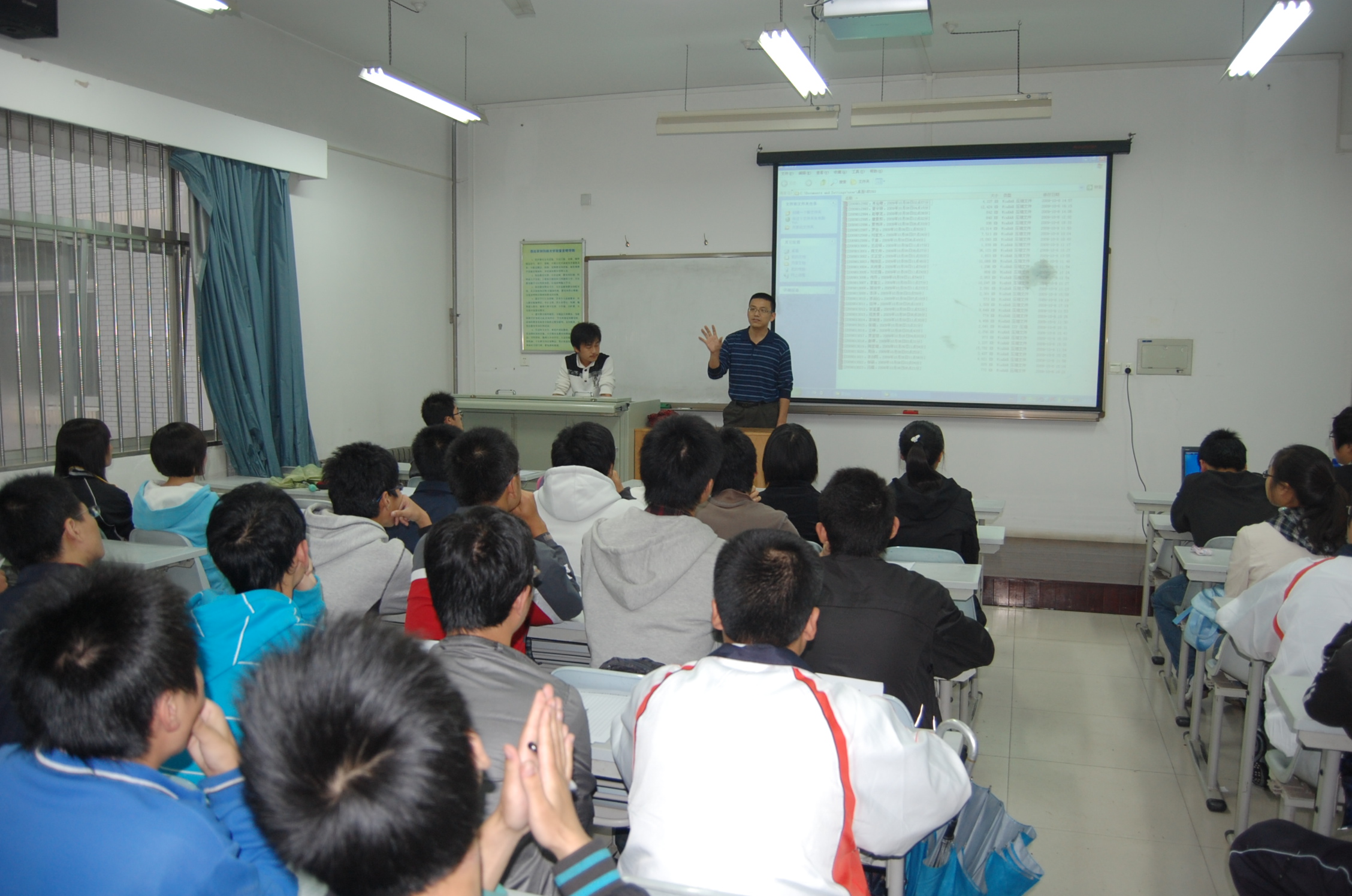 10月9日下午,北校区8206和其他8个教室里正进行着一场别开生面的课堂教学,站在讲台上的不是老师,而是学生。原来信息学院09级新生正在做计算机基础训练任务展示。学院党委樊世明书记、软件工程系主任张阳教授、党委何卫军副书记和部分班主任到场观摩。