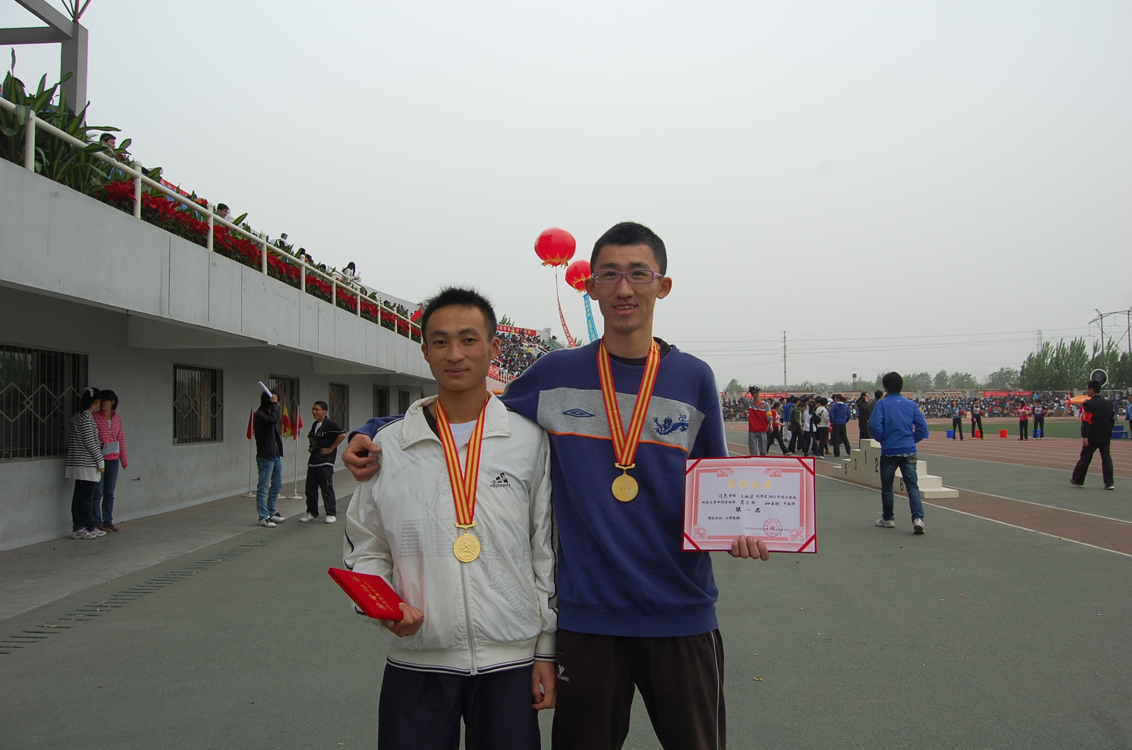 19日上午,我院何李军同学在男子800m预赛中,表现出了十足的信心,以预赛第一名的成绩轻松晋级决赛。下午三时左右,何李军同学再次出征,枪声一响,何李军同学如离弦的箭一样奔向终点,两圈过后,何李军同学以明显优势成功问鼎男子800m比赛。赛后校宣传部副部长闫德忠和校党工委副书记赵阿兰为何李军同学颁发金牌和奖状并合影留念。