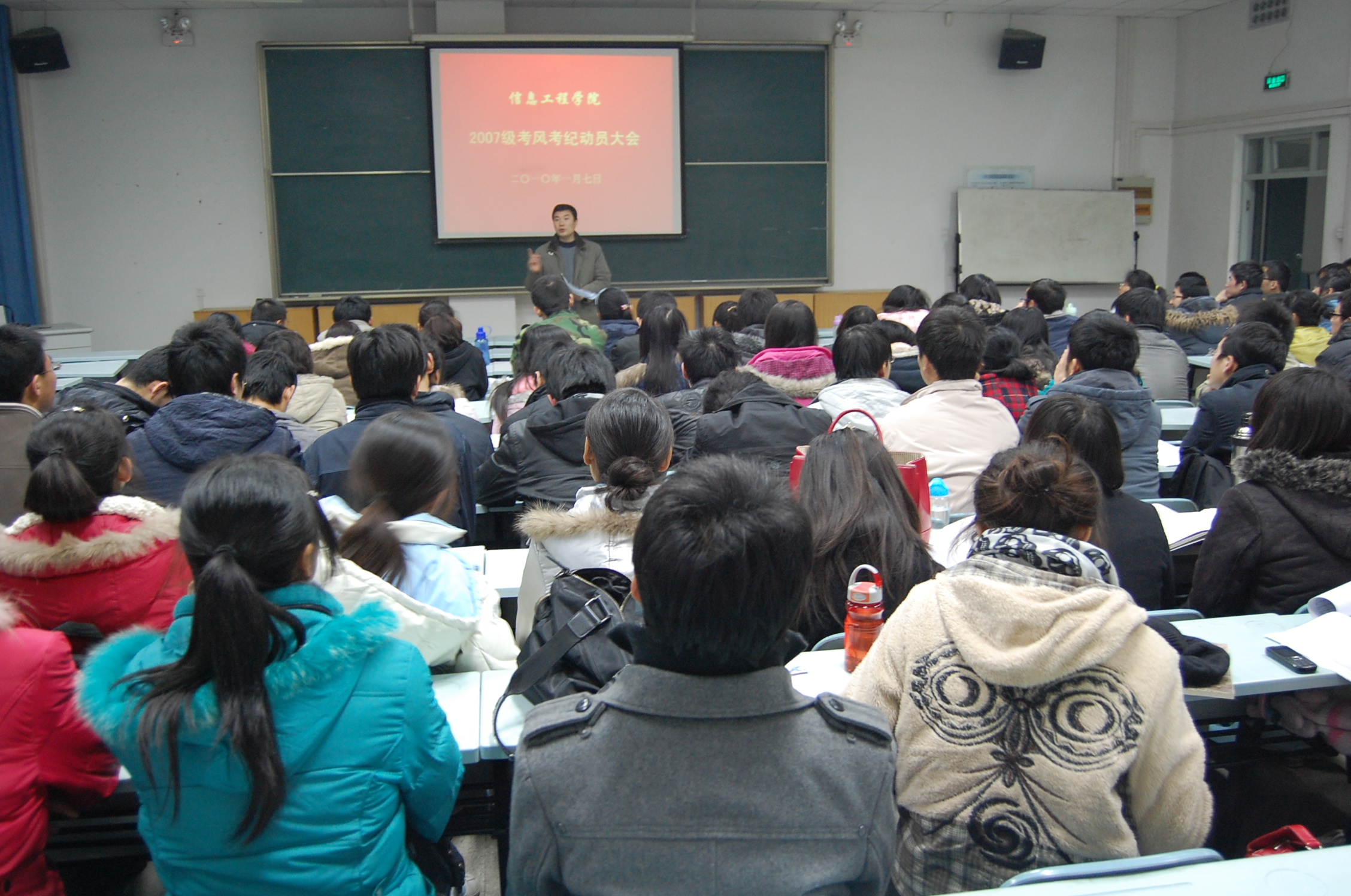 为落实学校加强考风考纪工作会议精神,进一步强化我院学生诚信意识,严肃学生考试纪律,杜绝学生考试违纪、作弊现象,根据学院加强考风考纪工作会议安排,1月7日下午和晚上,学院分别对2007级和2009级学生分年级召开了加强考风考纪动员大会。学院党委书记樊世明和党委副书记何卫军分别就诚信考试做了动员讲话和具体安排。全体辅导员和部分班主任参加了动员大会。