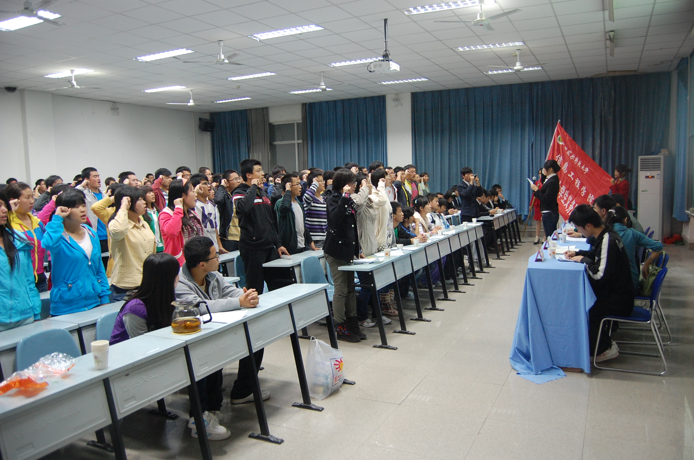 当晚七点半,信息学院阳光团工委宣誓大会正式开始,出席会议的有学生工作秘书王淑珍、辅导员谷申杰、桂恺、倪玲、校阳光团工委负责人王攀琪,2011级受资助的同学以及学院各部部长和校其他学院阳光团支部书记。大会上,王淑珍老师作了重要讲话,强调了受国家资助的同学们要懂得感恩国家、父母,并且要坚持努力学习,战胜经济困难,成为精神强者。王淑珍老师真挚动人的话语感动了在场的每一位学生。