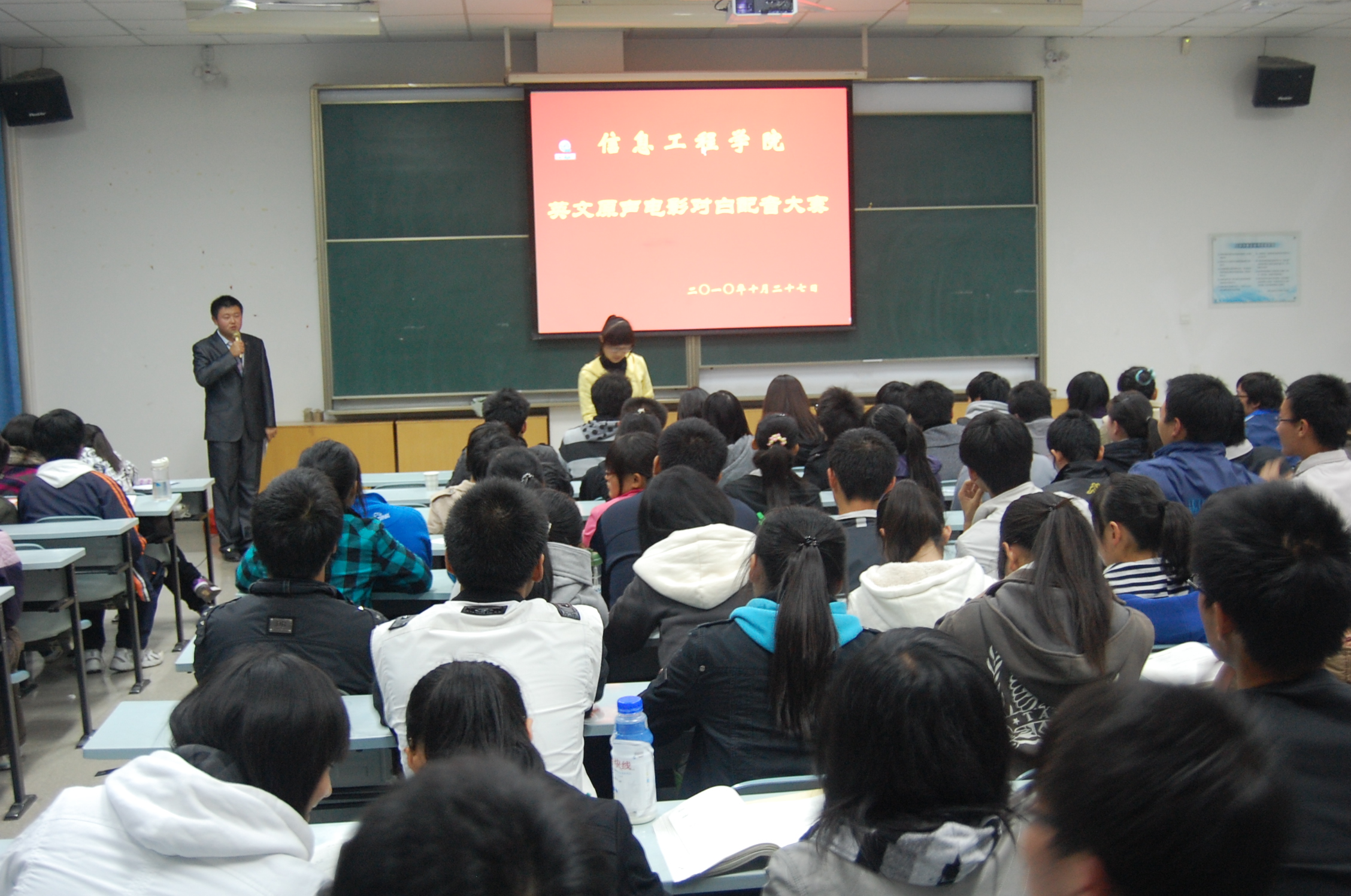 10月27日晚,信息工程学院在信工楼M2教室成功举办英文原声电影配音大赛。校学习部副部长张学治,外语系杨丹、王素素以及上届冠军琪非、辛彤学长等担任此次大赛的评委。