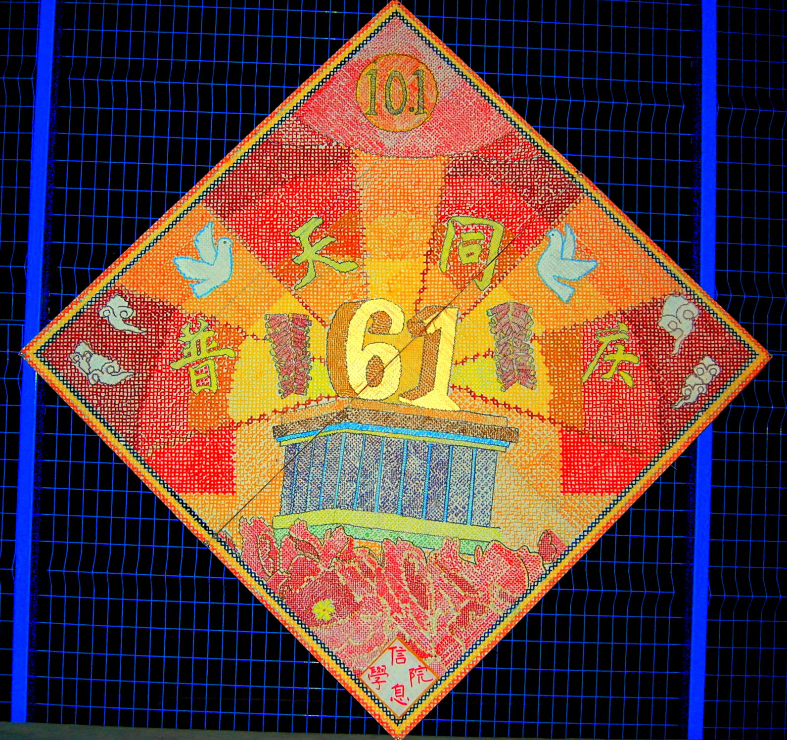 其中,信息学院的同学们以十字绣的形式为创意,将两张宣传板拼在一起,画出100×100格子,做为“十字格布”;然后仿照十字绣中经纬交织搭十字的方法,画出相关的图案和文字。整个宣传板共十余人历时两天两夜零一下午制作完成。