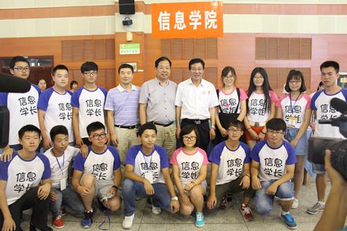 8月29日下午,北绣山活动中心迎新工作仍在火热进行中,孙其信校长的身影出现在大厅迎新人员的视野中。校长的到来仿佛把场外炽热的阳光也领了进来,大厅内的气氛瞬时热烈起来。看到校长,大家的士气受到了鼓舞,干劲也更加充足了起来。信息学院的领导、老师以及迎新志愿者,纷纷起立,迎接校长的视察和慰问。