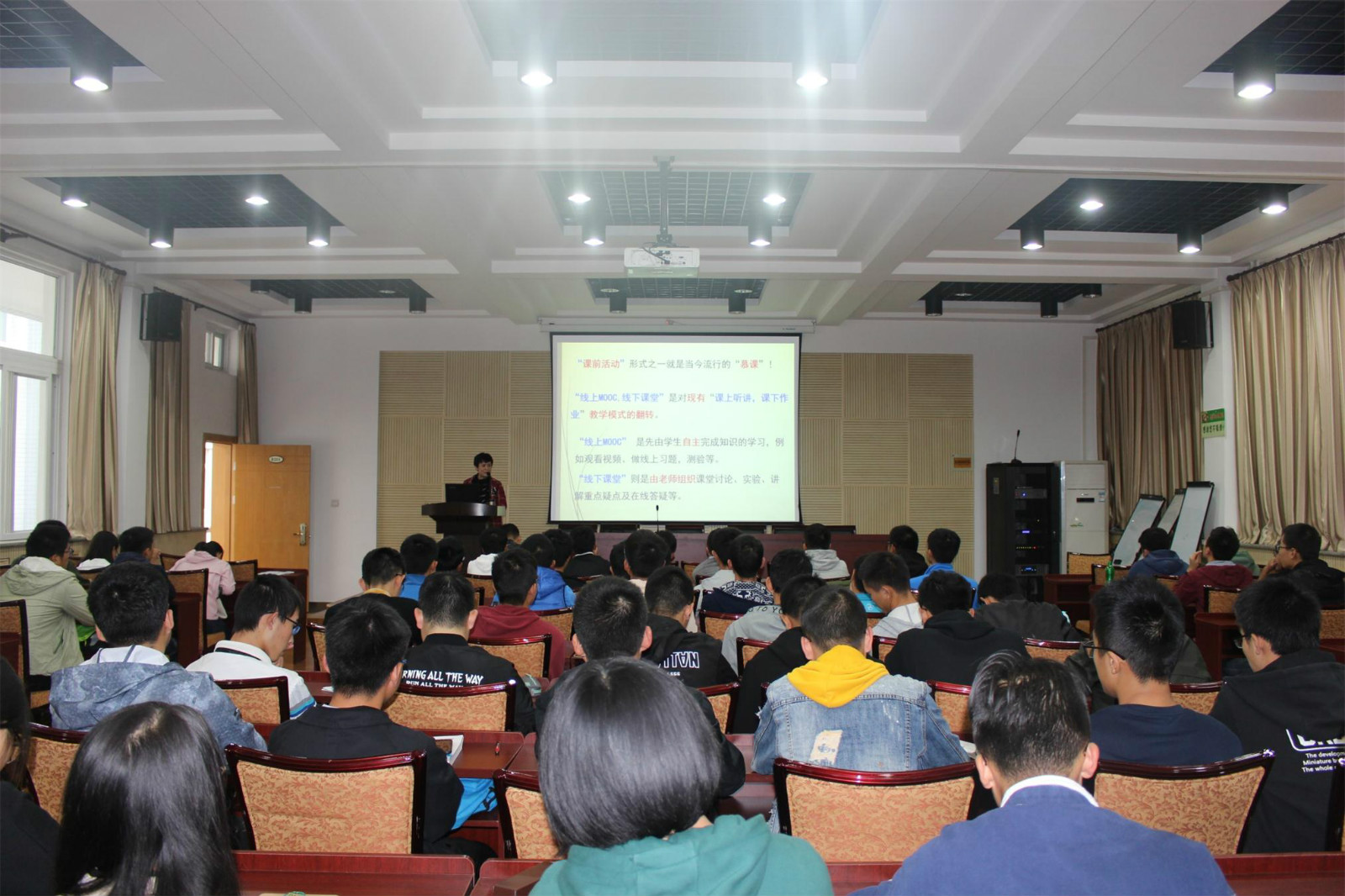 主讲人任国霞副教授介绍了“慕课”这一课外学习的主要形式,列举了Coursera等国内外知名在线学习网站。随后,任老师以自己在中国大学MOOC平台上学习的五门课程为例,详细讲述了慕课的学习方式、课程特点、特色功能等。她讲到:“慕课是一种轻量级的学习方式,不是在增加额外负担。我坚持了几个月后,发现自己爱学习了,每天都期待着发布新的课程。”任老师还了近日在中国大学MOOC平台上线的我校姜在民老师程“植物学”课程片花、网红老师嵩天主讲的《Python》课程片段等,激发了同学们的学习兴趣和热情。