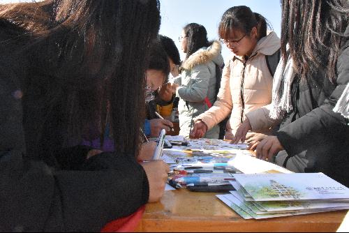 还未放学,工作人员便早早支起了三张桌子,静候着学生下课。右边第一张桌子放的是说说集赞的礼物,剩下两张桌子则放了许多明信片,以供学生们填写。下课后,很快,桌子旁边便被学生们围得水泄不通。工作人员明信片一张接着一张地发出去,同学们认真的将自己对母校的思念写在这一张张明信片上,而工作人员则将写好的明信片收好,以便于之后寄出。