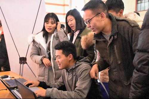 信息学院充分立足学院的学科基础、发挥学科特色,参展作品中不乏高科技、高水平的作品,其中主要是动漫设计大赛,软件大赛的优秀作品以及一些学生们自己设计的游戏。动漫设计大赛的作品将中国梦融入我们的现实生活与Flash动画中,通过动漫作品阐述属于我们的中国梦,令现场观众们赞叹不已。同时还有学生们用各种软件制作的游戏,如《3D坦克大战》,这是一款简易版的射击游戏,大家可以在里面驰骋战场,奋勇杀敌。此外,《3D视觉岛屿游戏》,也是一款基于视觉立体的游戏,操作者可以在山清水秀的岛屿上尽情遨游,在享受3D视角的同时仿佛置身人间仙境,为观众们带来了强烈的视觉冲击。展览过程中,信息学院团工委书记倪玲也在现场认真观看参展品并与学生热情交流,积极讨论,大家脸上都洋溢着喜悦的笑容。